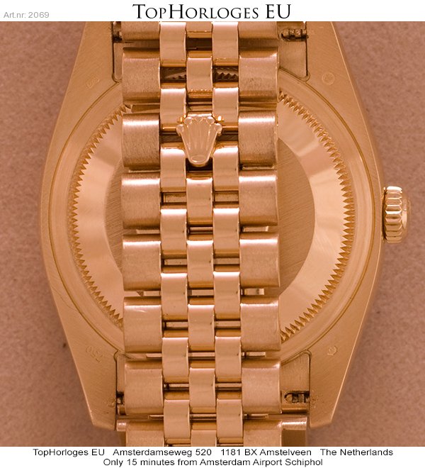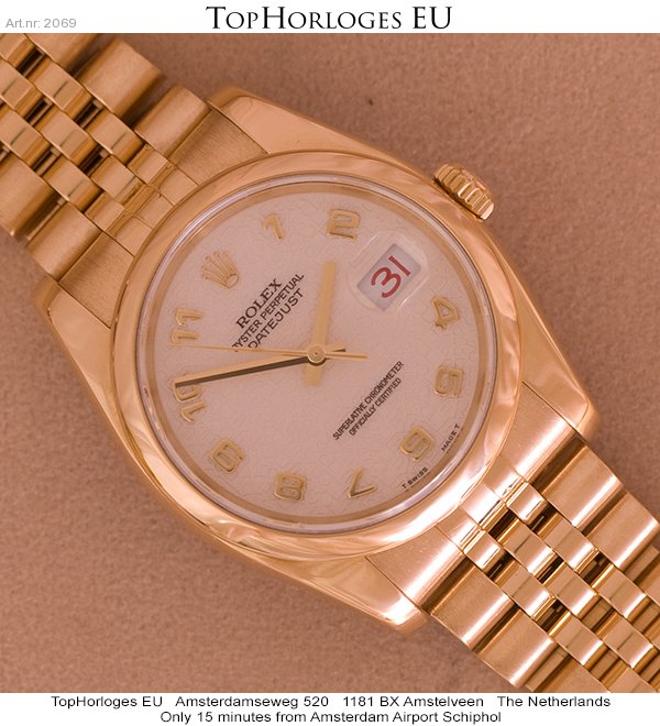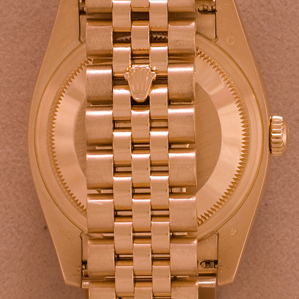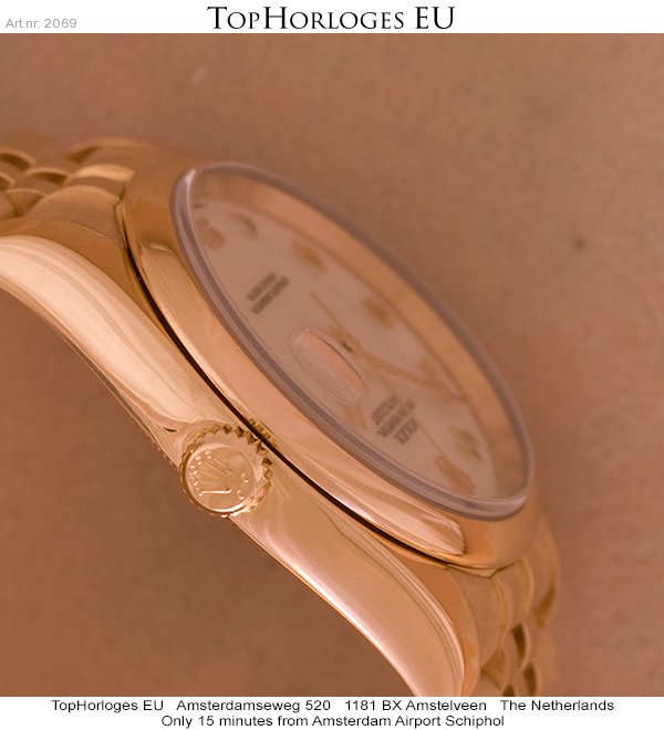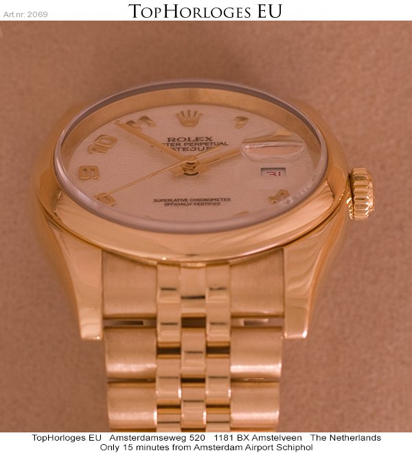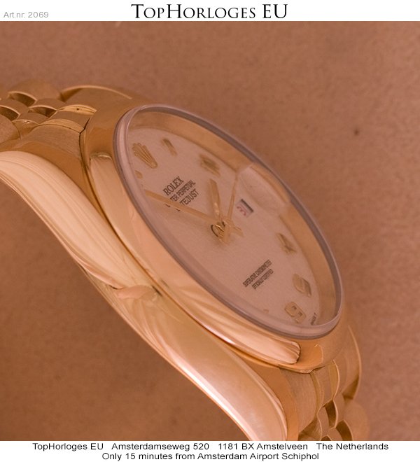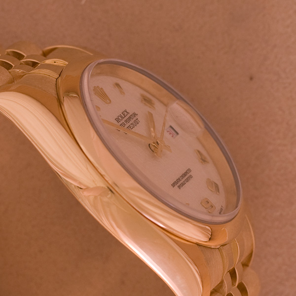 Een weinig gedragen gouden Rolex Date Just met gouden jubileum band en jubileum wijzerplaat.