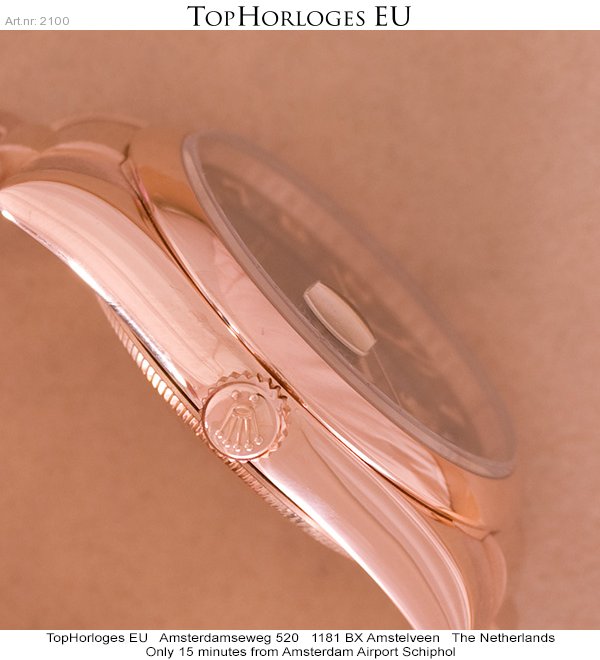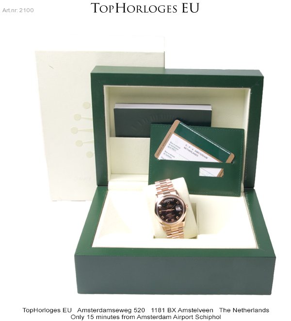 Een zo goed als ongedragen Rolex Day Date EverRose met gouden president band en nieuwste type vouwsluiting. Compleet met doos en papieren.