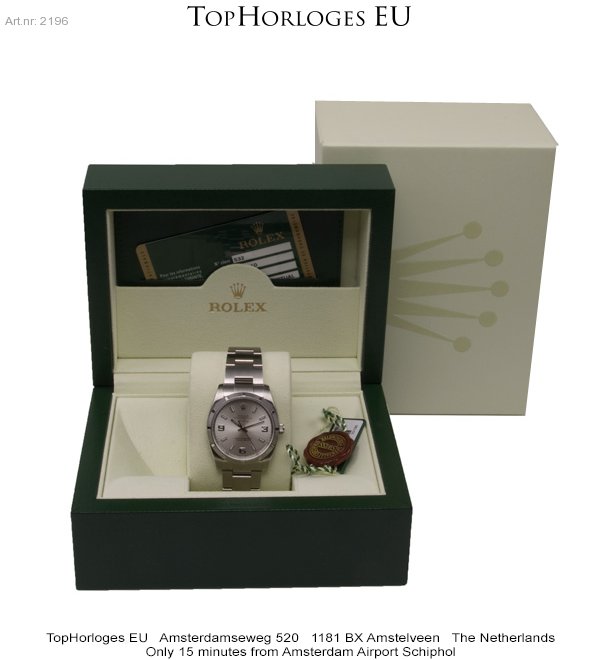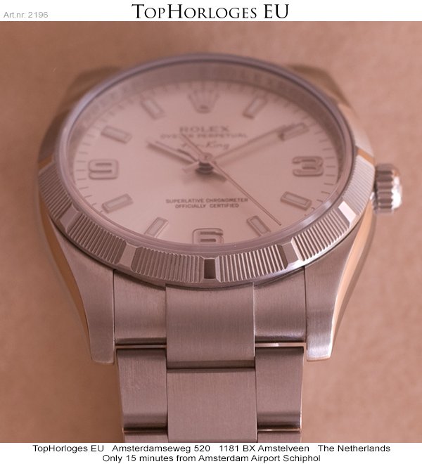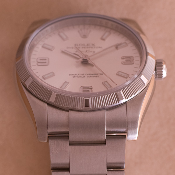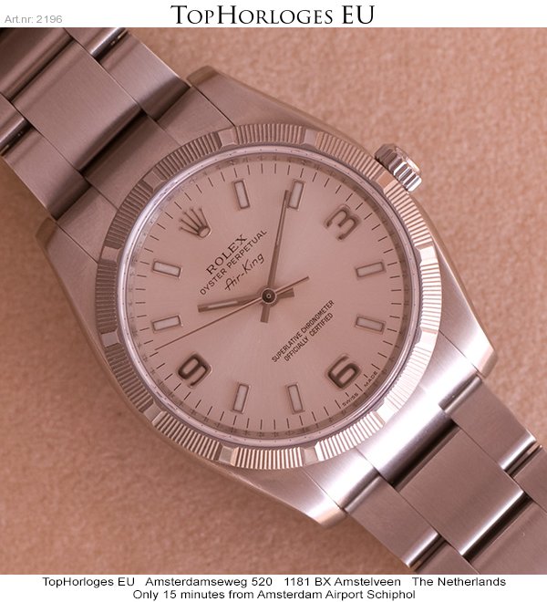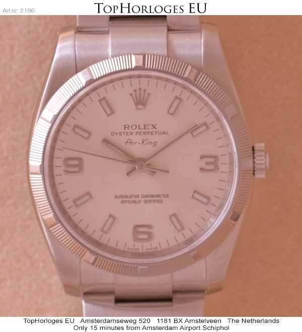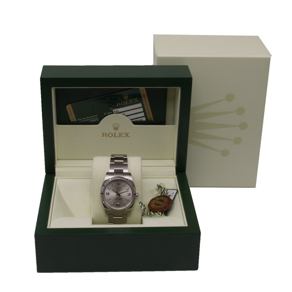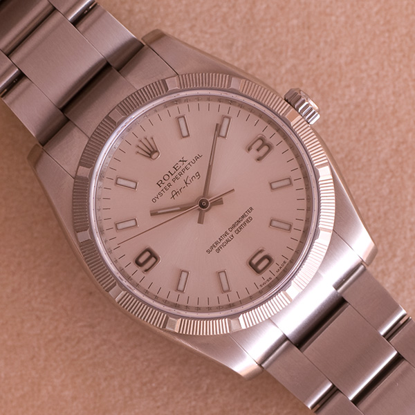 Een in nieuw staat verkerende stalen Rolex Airking met stalen Oyster band. Zilver grijze wijzerplaat met Arabische cijfers.