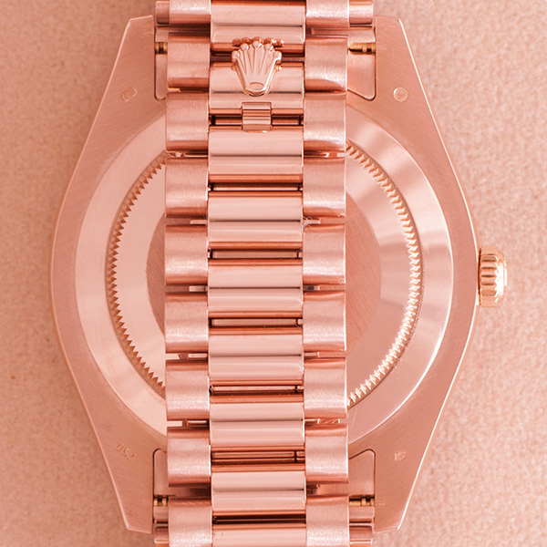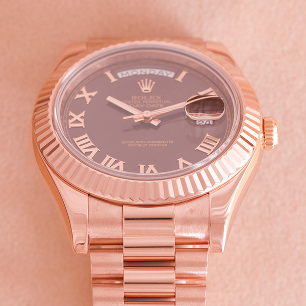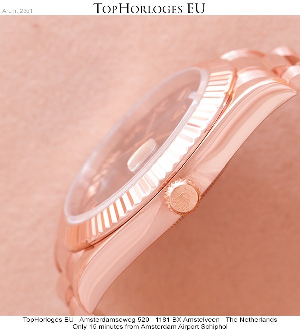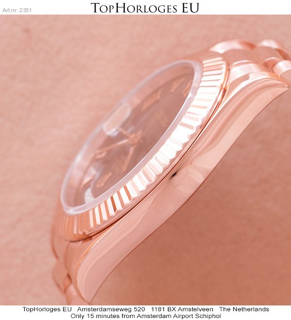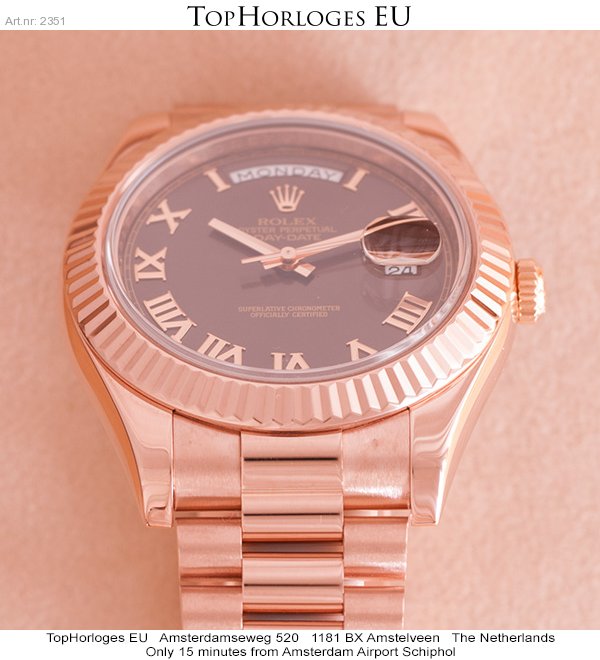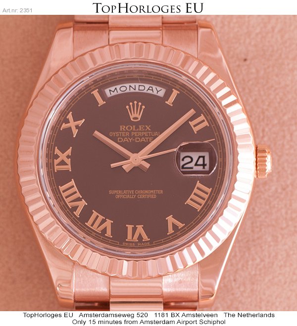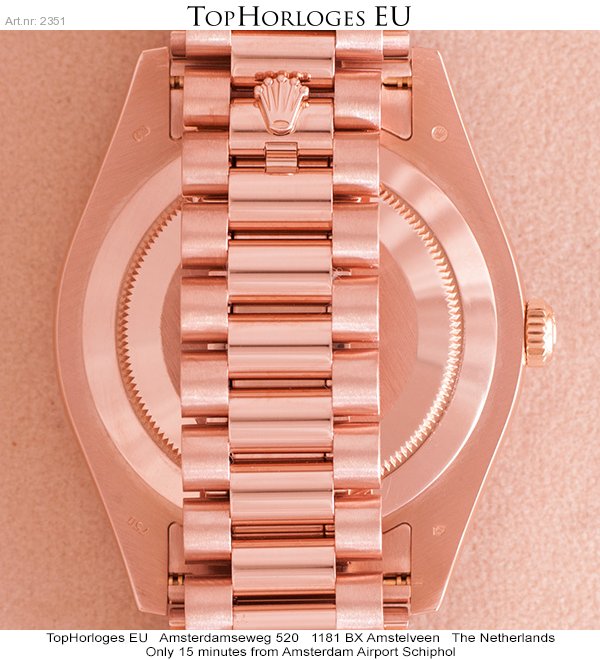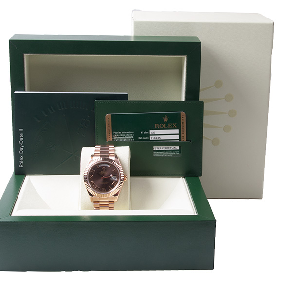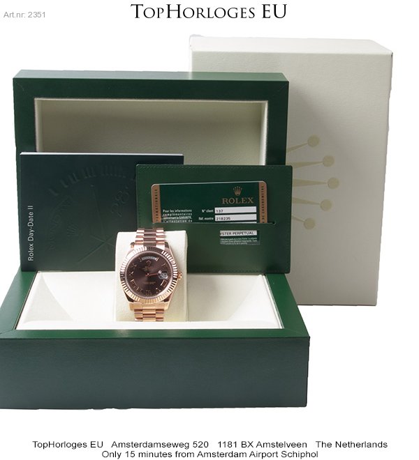 Een prachtige, haast ongedragen rose gouden Rolex Day-Date II. Deze nieuwste uitvoering is geheel compleet met doos en papieren (05-2011 NL) Almost un-worn Everose / Chocolate dail DateDate box&papers.