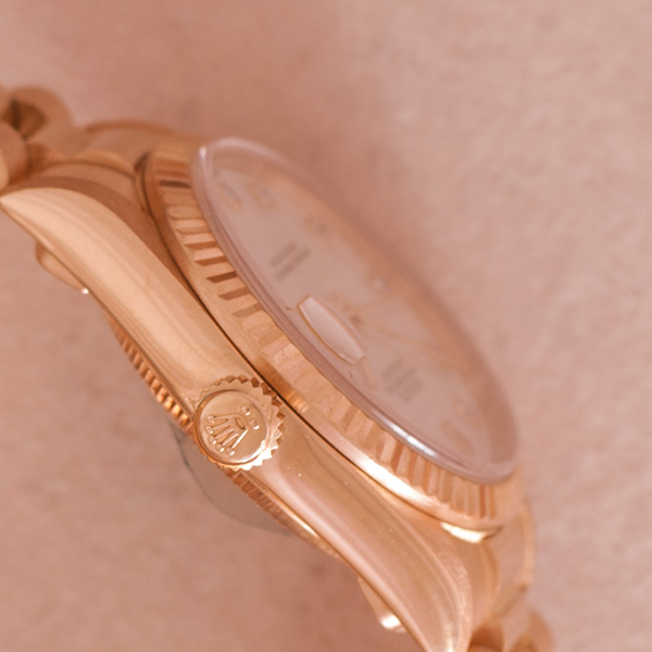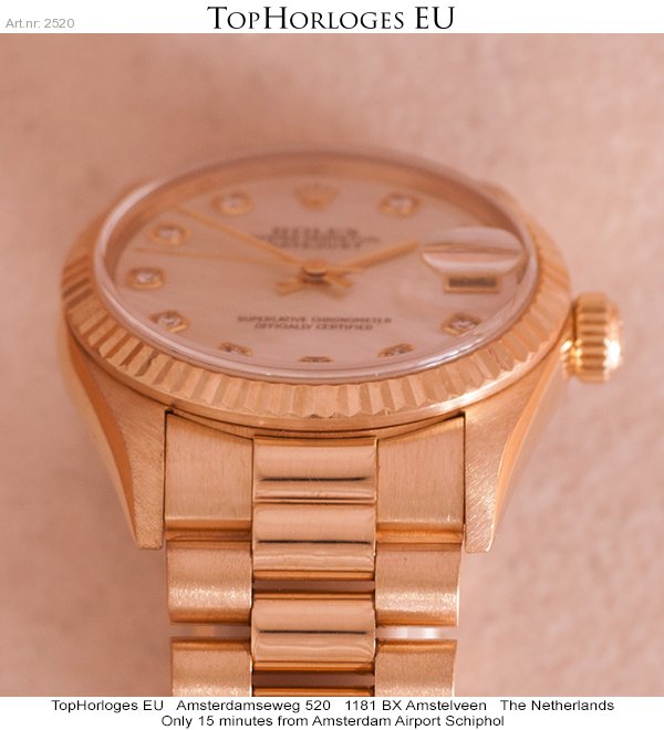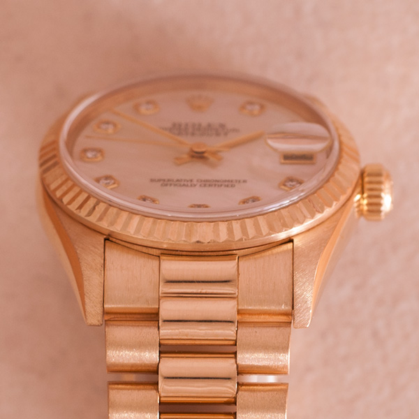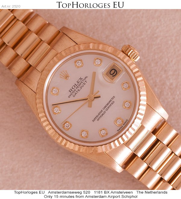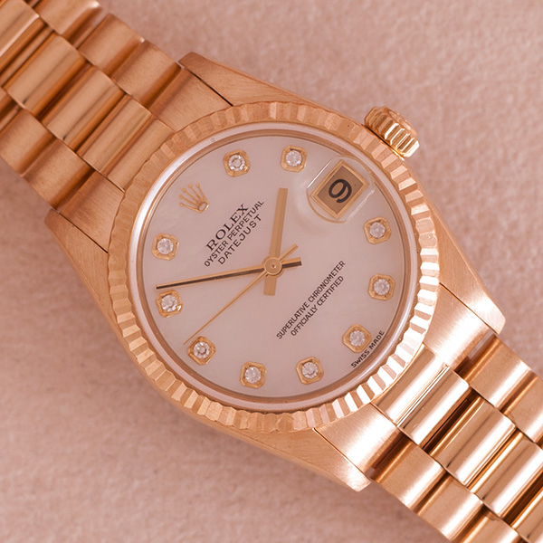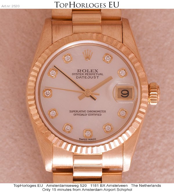Een prachtige, gouden Rolex Datejust Mid-size, deze uitvoering is voorzien van een schitterende parelmoer wijzerplaat met diamanten. (A-serie)