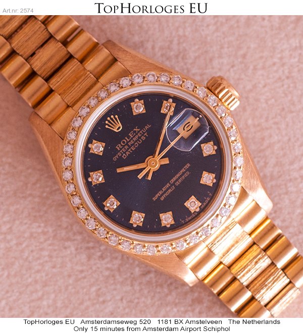 Een weinig gedragen gouden dames rolex. Deze boomschors, datejust is voorzien van een originele wijzerplaat met diamanten op de uren. Tevens heeft hij een, aftermarket, volledig briljanten rand. Geheel compleet met doos en papieren.