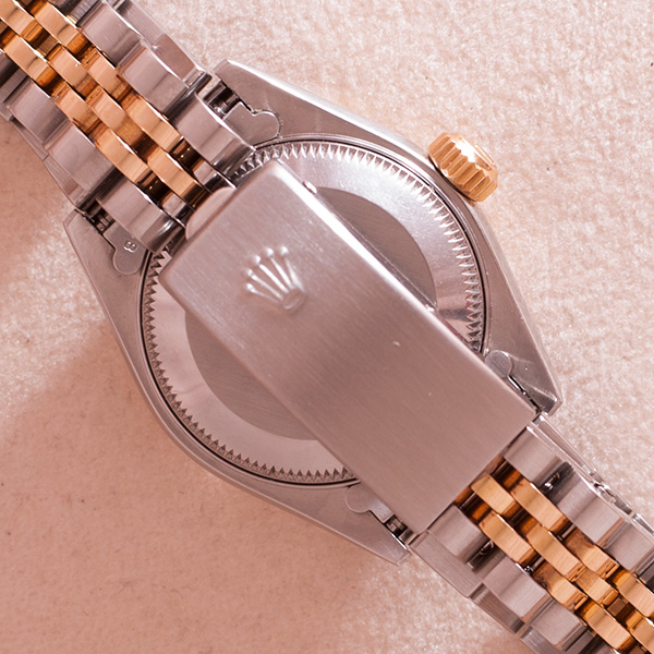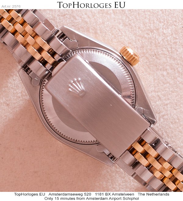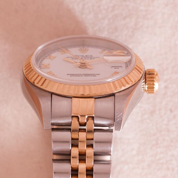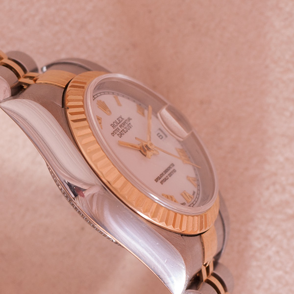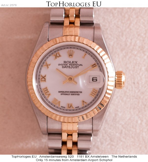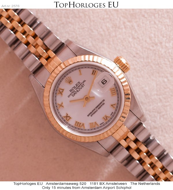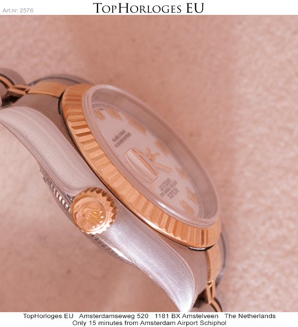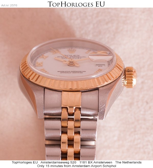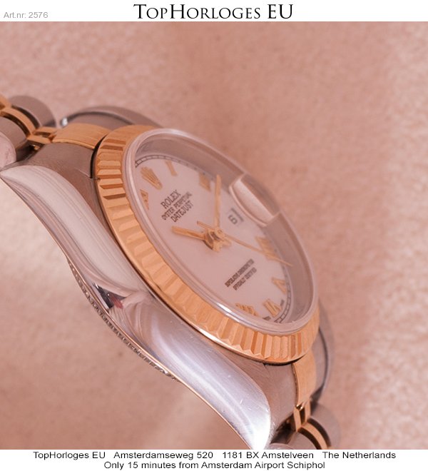 Een zeer mooie dames rolex met goud-stalen jubileum band en witte wijzerplaat.