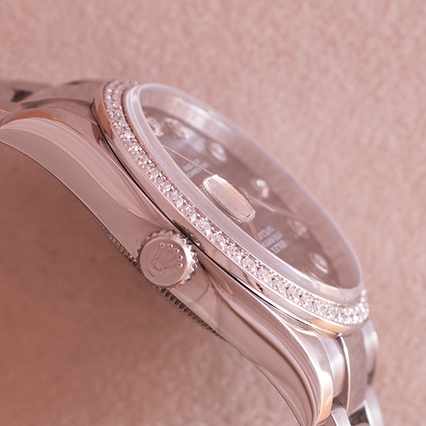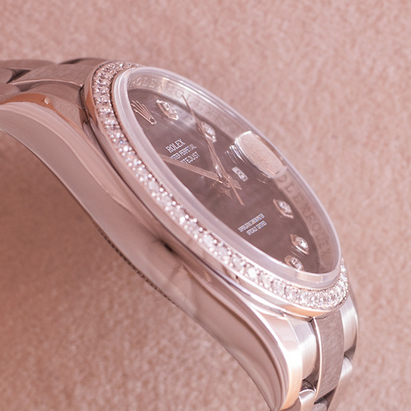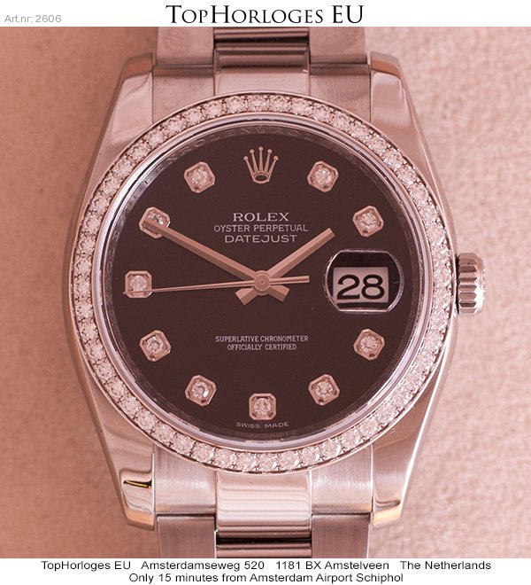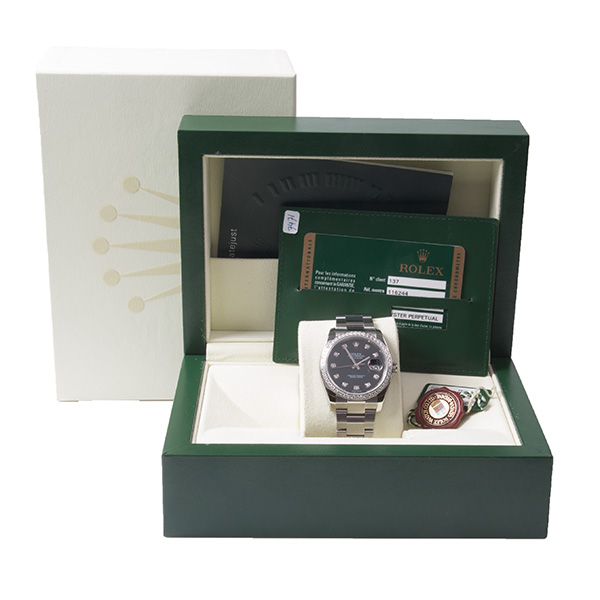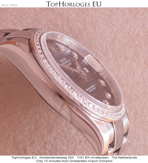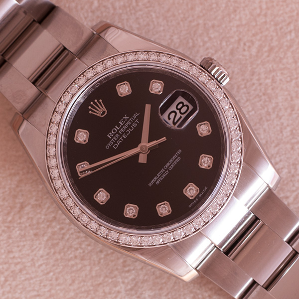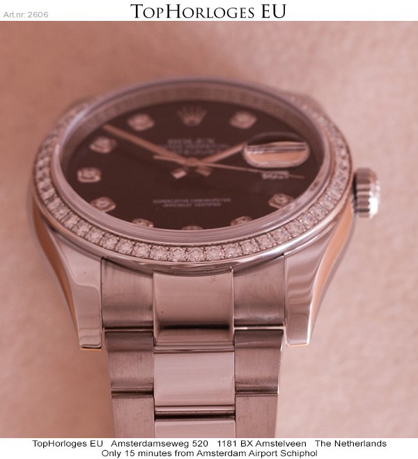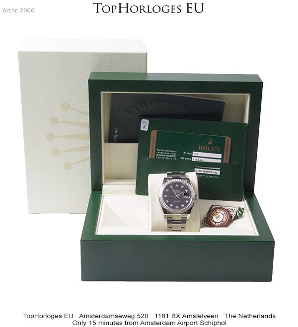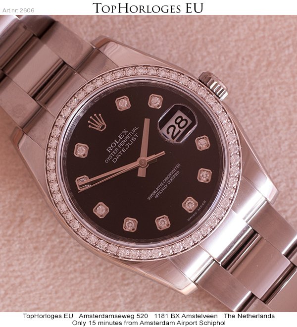 Een zeer mooie stalen Rolex datejust met de originele fabrieks geleverde briljanten lunette en zwarte wijzerplaat met diamanten index.