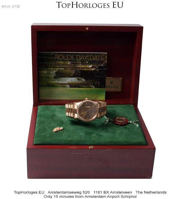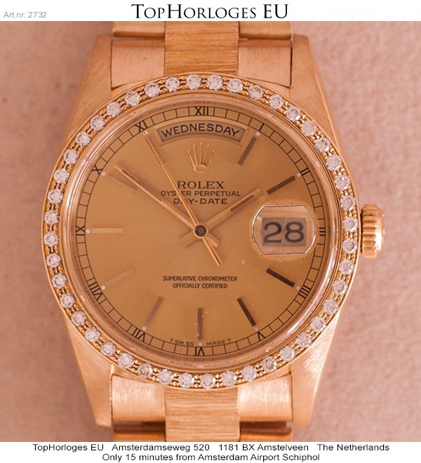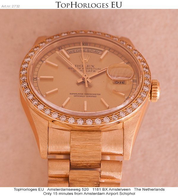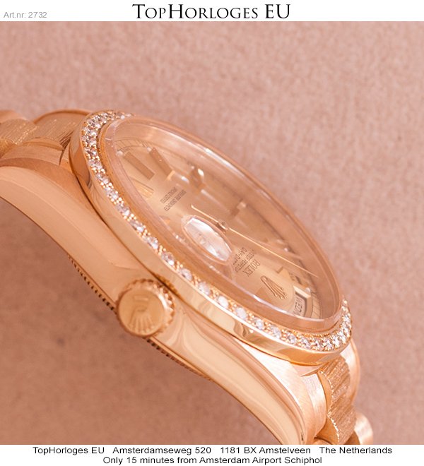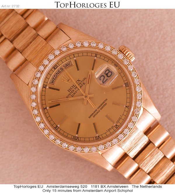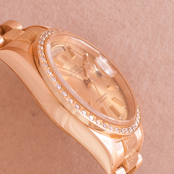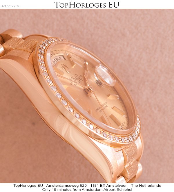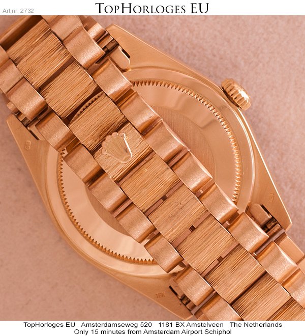 Een zeer weinig gedragen Rolex Daydate met gouden president band, boomschors uitvoering.