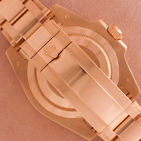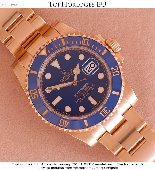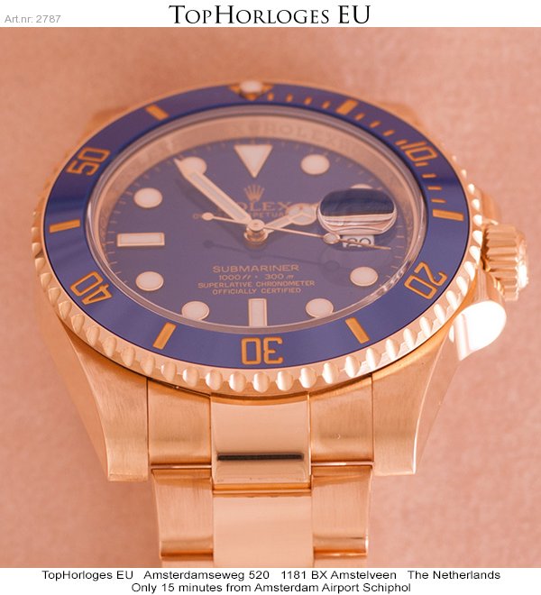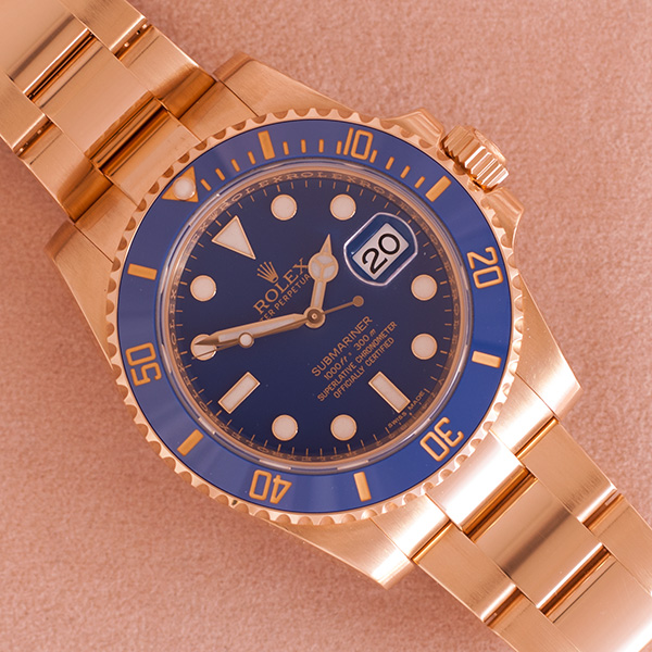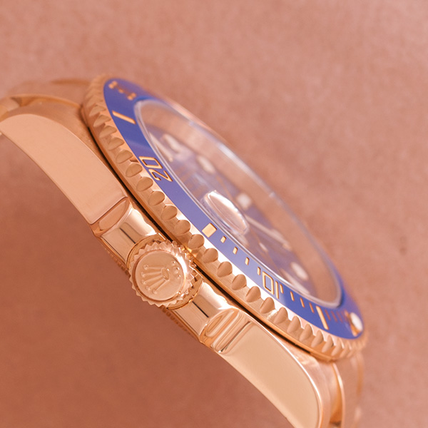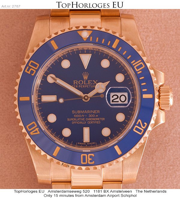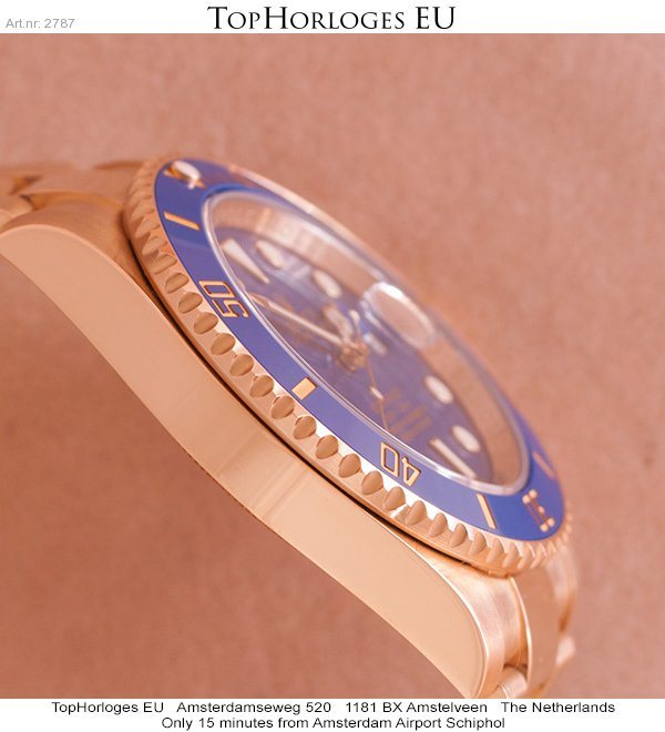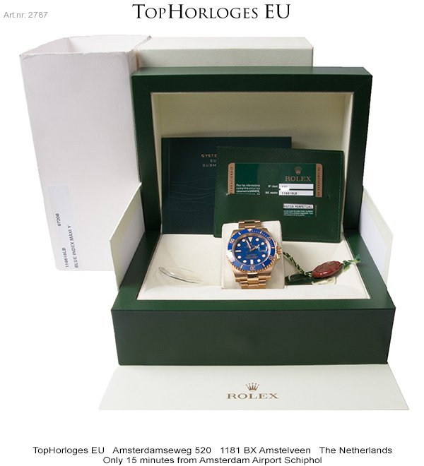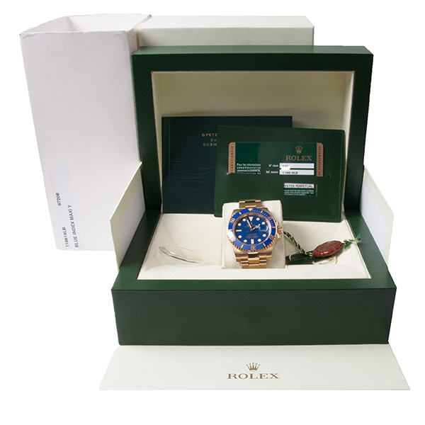 Een ongedragen Rolex Submariner in het geelgoud met blauwe ceramische lunette en wijzerplaat.