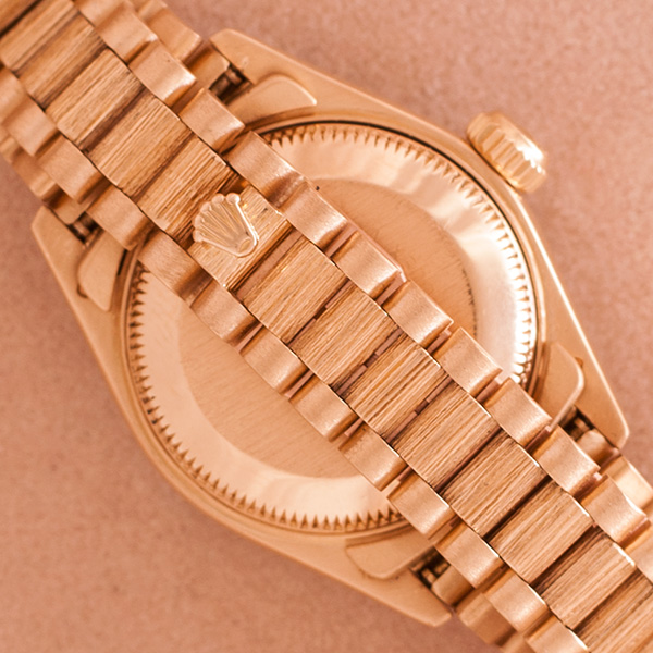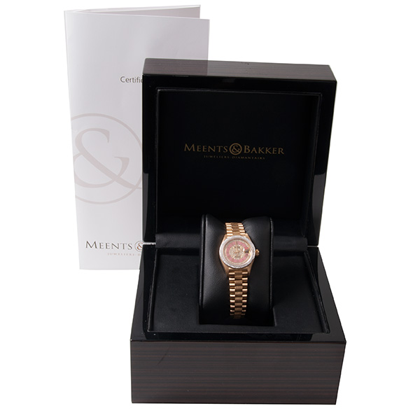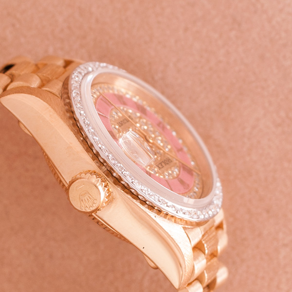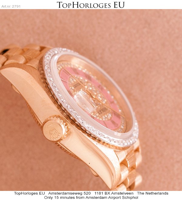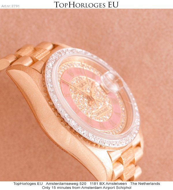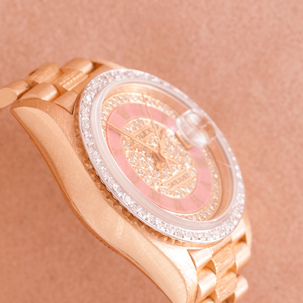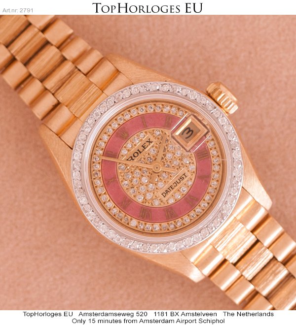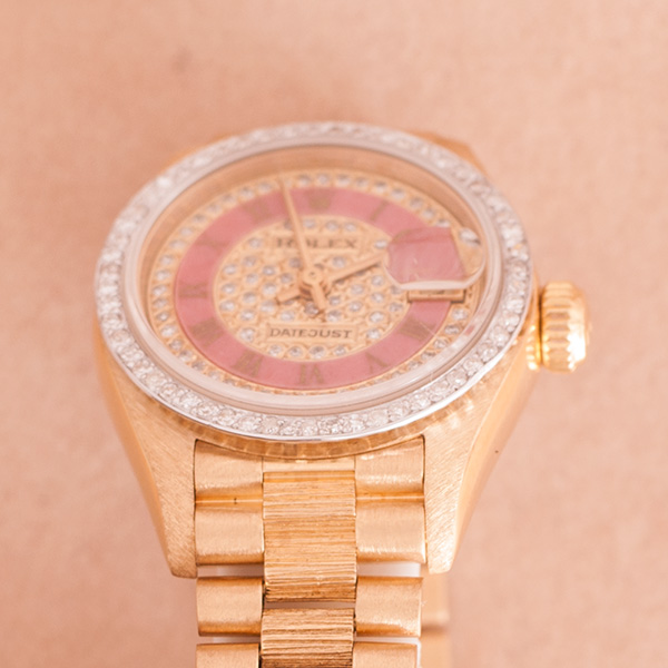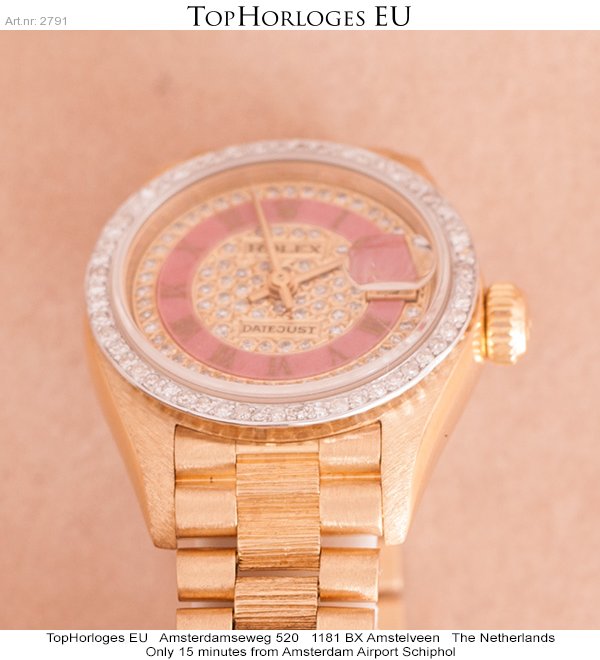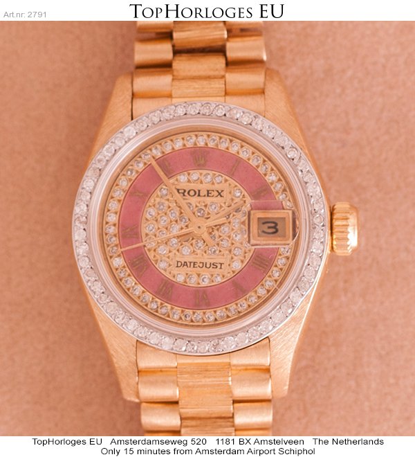 Een gouden Rolex Datejust, deze dames boomschors is voorzien van een diamanten wijzerplaat en rand ( aftermarket )