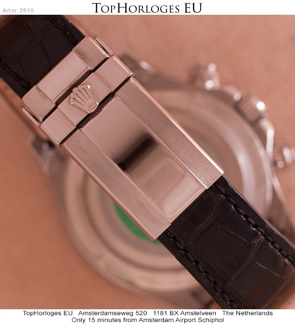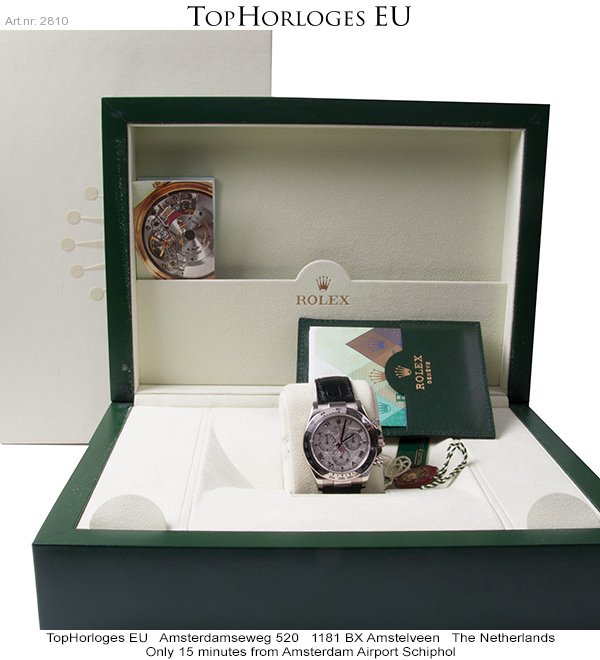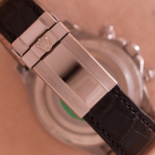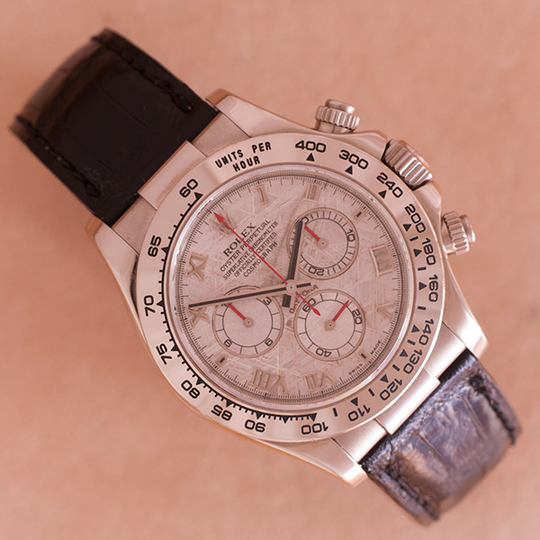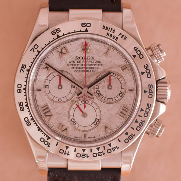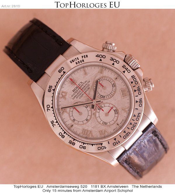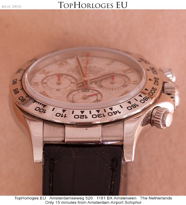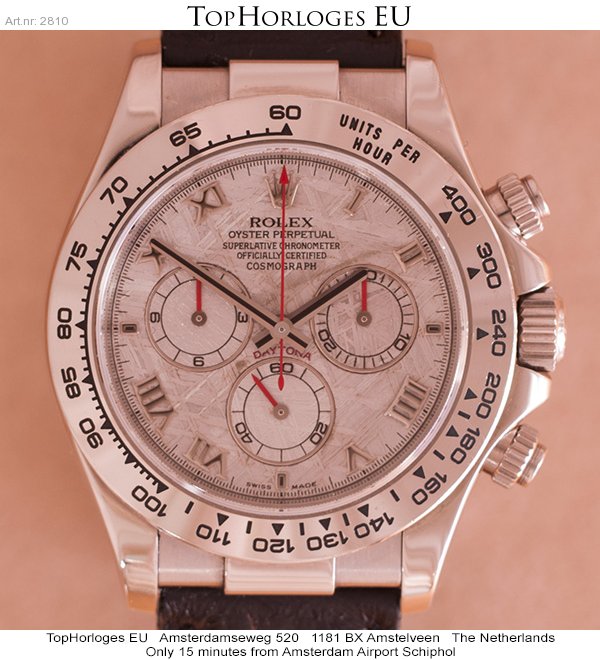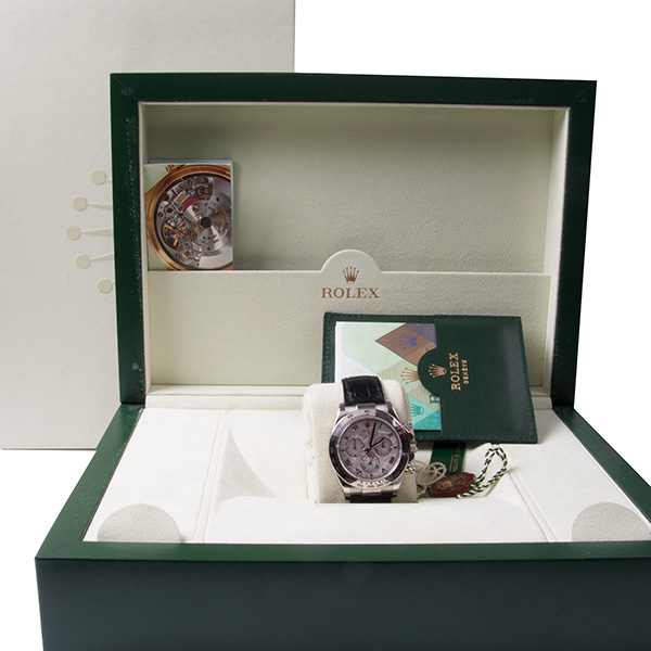 Een haast ongedragen witgouden Rolex Daytona met prachtige meteoriet wijzerplaat en romeinse index.