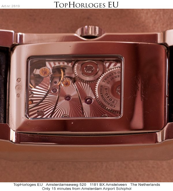 Witgouden tank vormige kast met decentrale seconde wijzer.