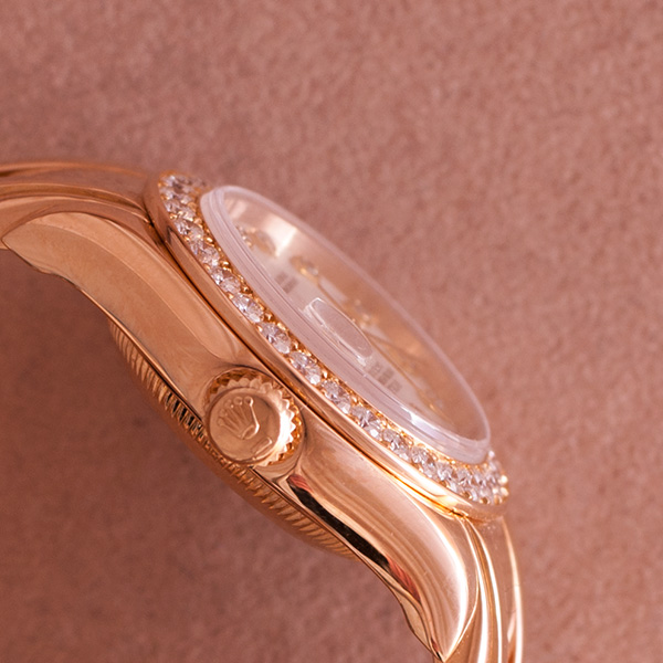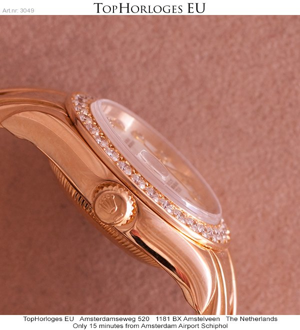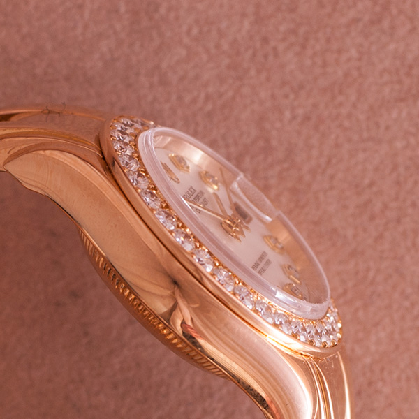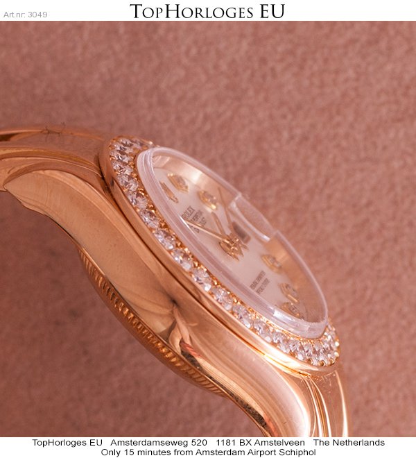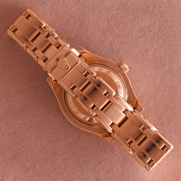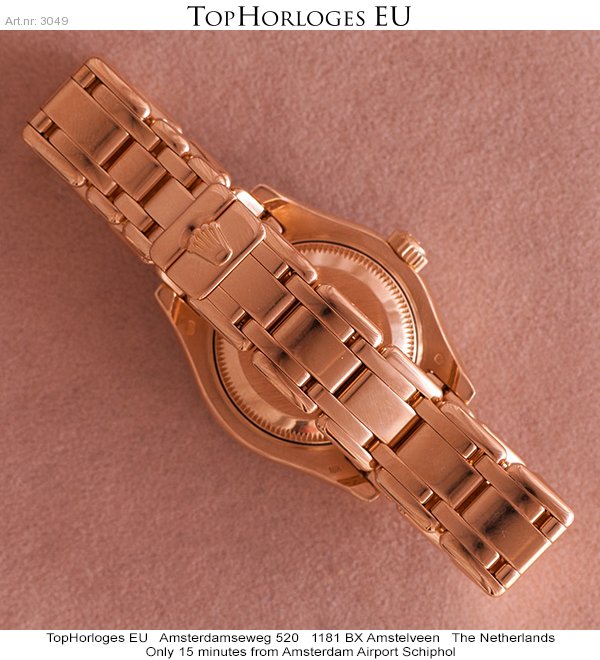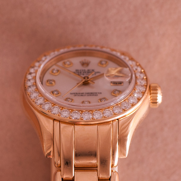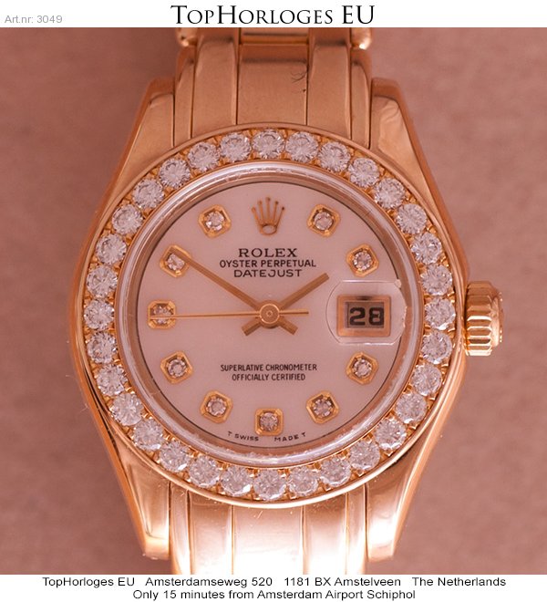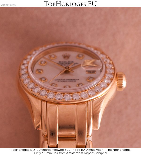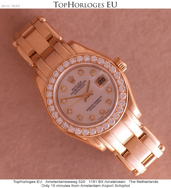 Ee zeer mooie Rolex lady datejust Pearlmaster met gouden band en originele met briljant bezette lunette. En een prachtige parelmoer wijzerplaat met diamanten uur indexen.