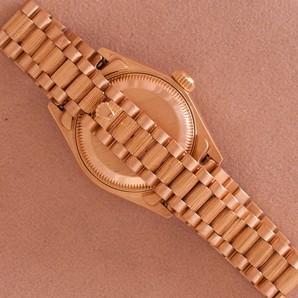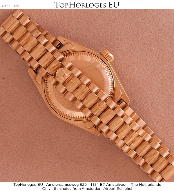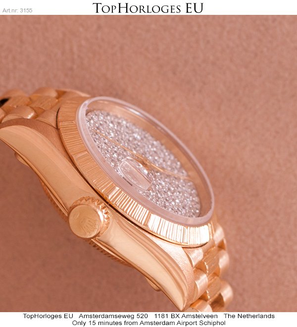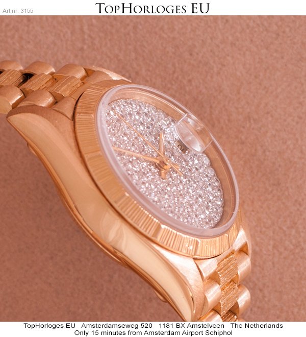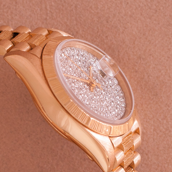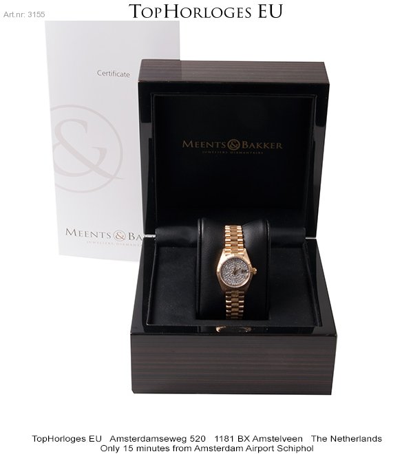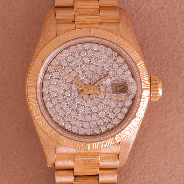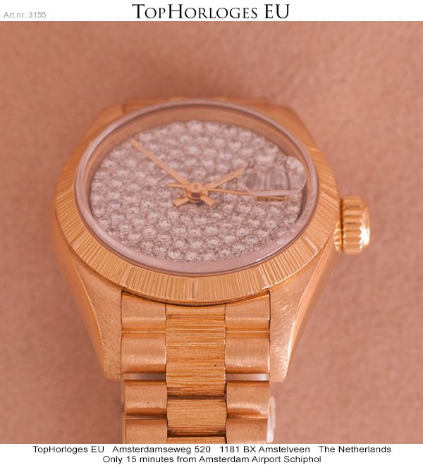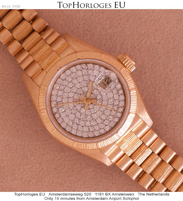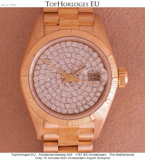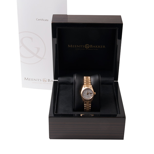Een 18krt. gouden dames Rolex Boomschors. Deze datejust is in een prima staat, en is voorzien van een geheel met diamant gezetten wijzerplaat. (aftermaket)