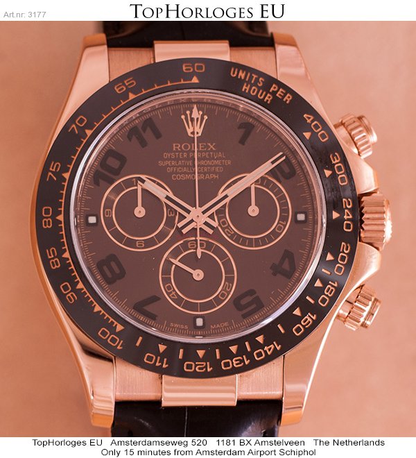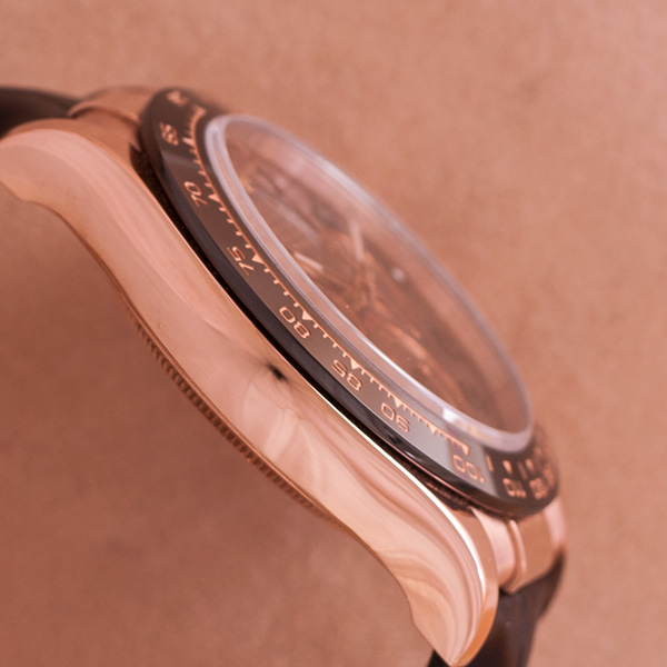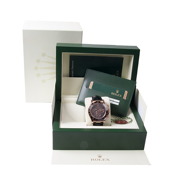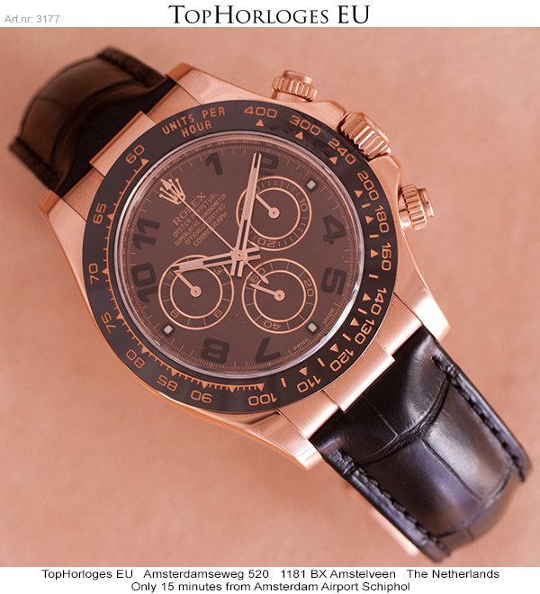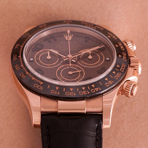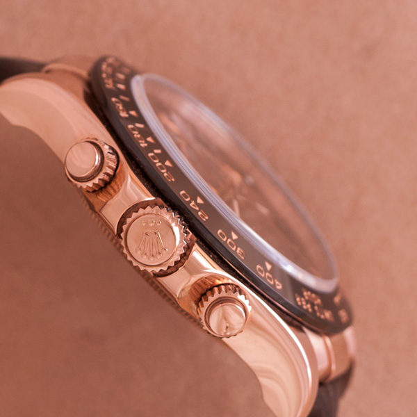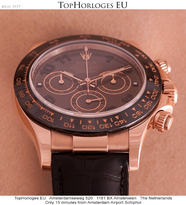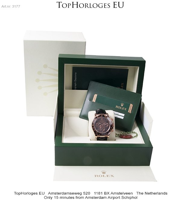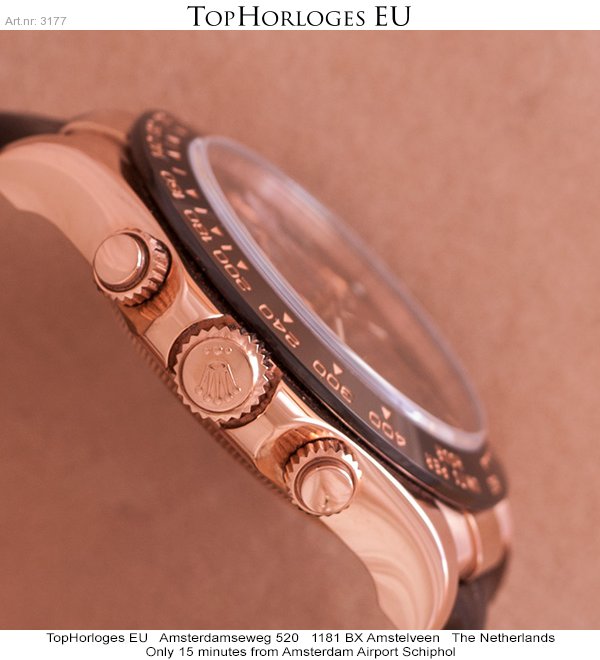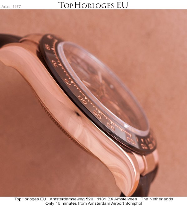 Een zo goed als ongedragen Everose gouden Rolex Daytona met lederen band. Compleet met doos en papieren (NL09/2013)
