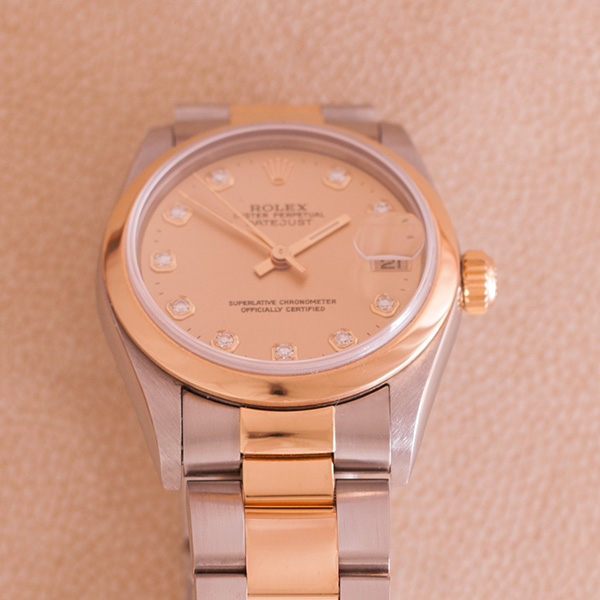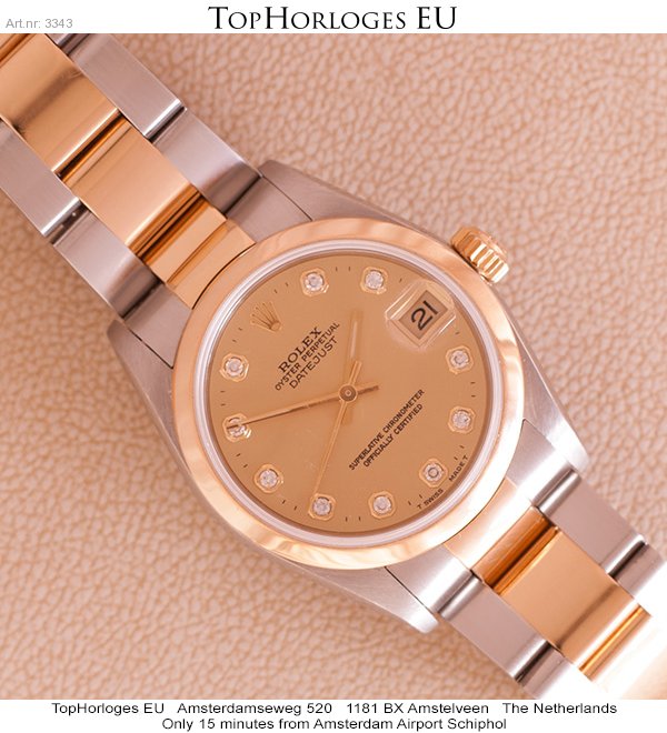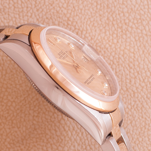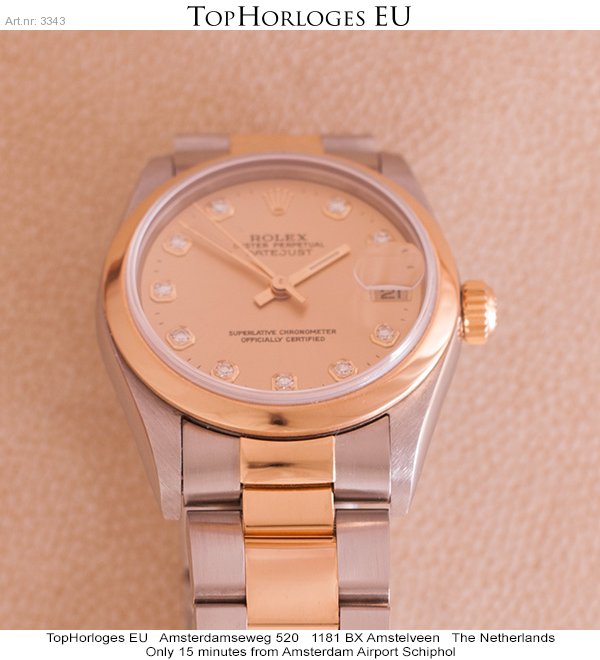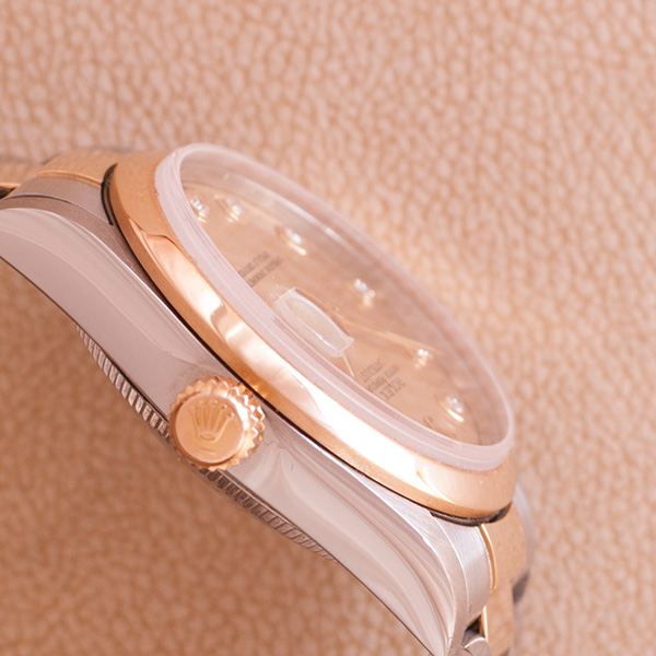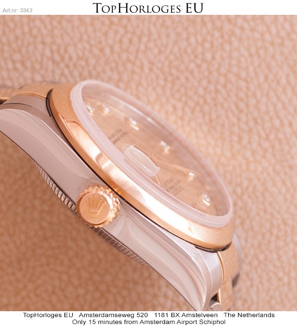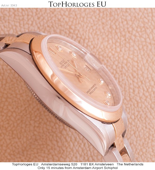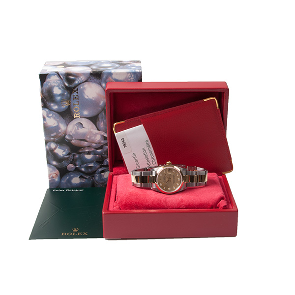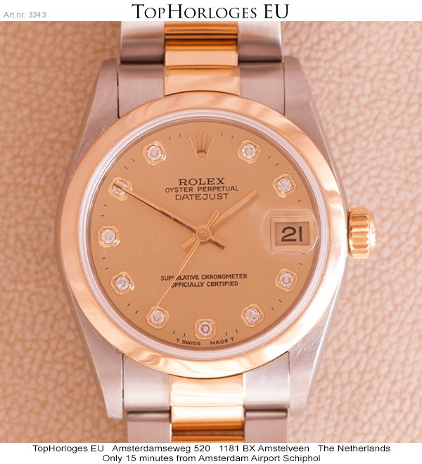Een weinig gedragen goud/stalen Rolex DateJust. Deze Mid-Size is in een zeer goede staat. Prachtige wijzerplaat met diamanten uurindexen. Compleet met doos en papieren.