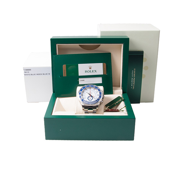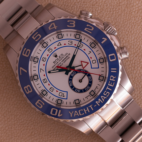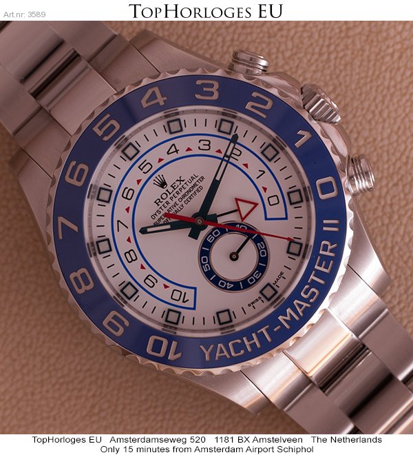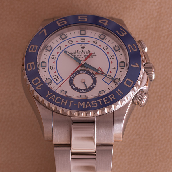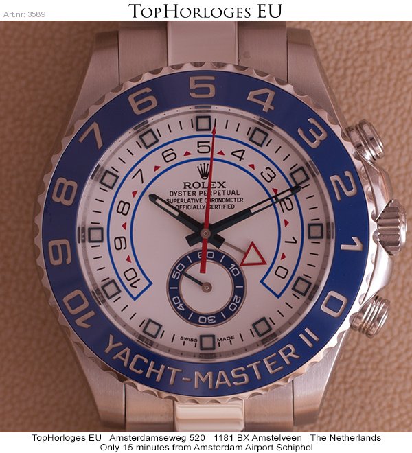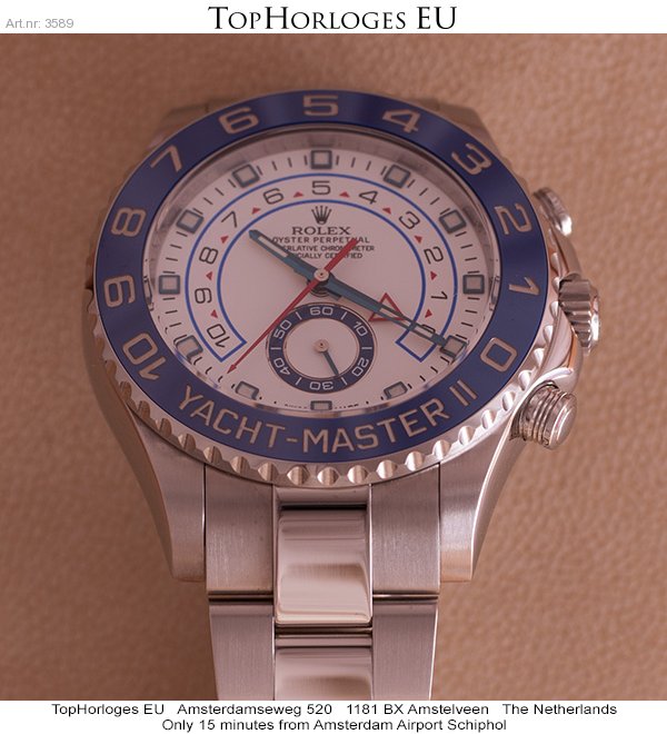 Een prachtige stalen Rolex Yacht-Master II. Deze nieuwste uitvoering is alleen uit de stickers gehaald, en slechts een keer om de pols geweest.