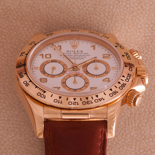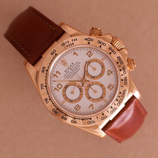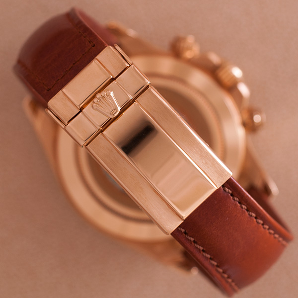 Beautiful Rolex daytona in yellow gold with black leather strap and golden folding clasp. Zenith movement.
