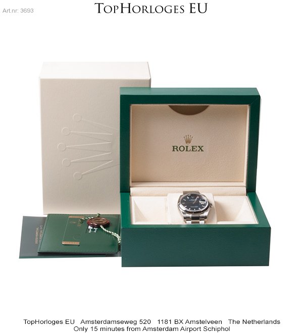 Een nieuwe stalen Rolex date (sealed), met blauwe wijzerplaat.