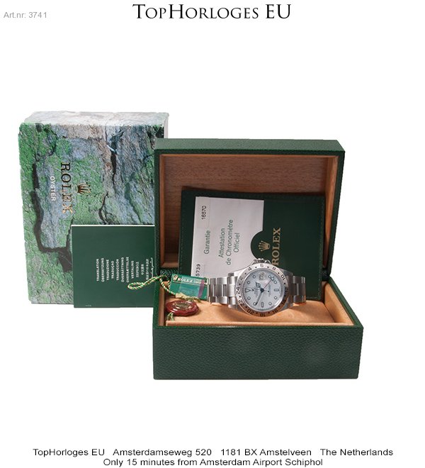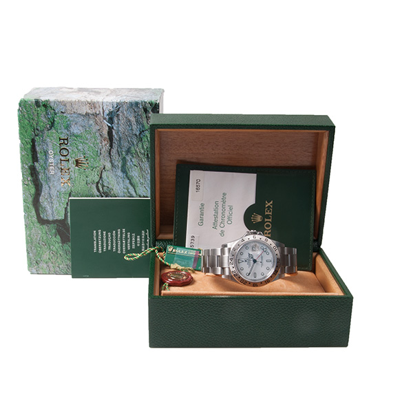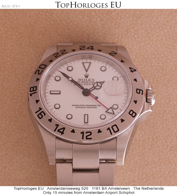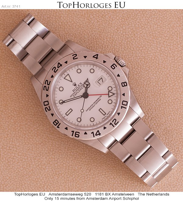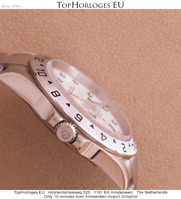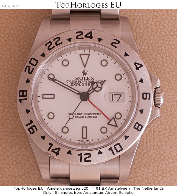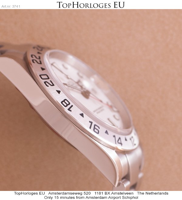 Een haast ongedragen stalen Rolex Explorer II met witte plaat. Deze dual-time is in een pracht staat, en tevens super compleet met de dozen, tag's en papieren. ( 2005 )