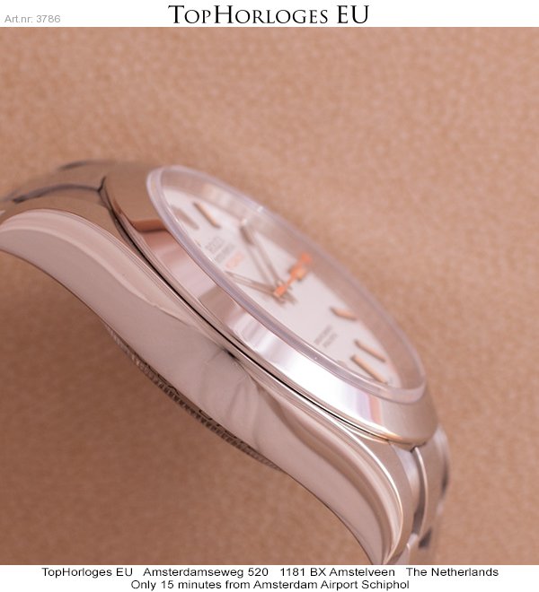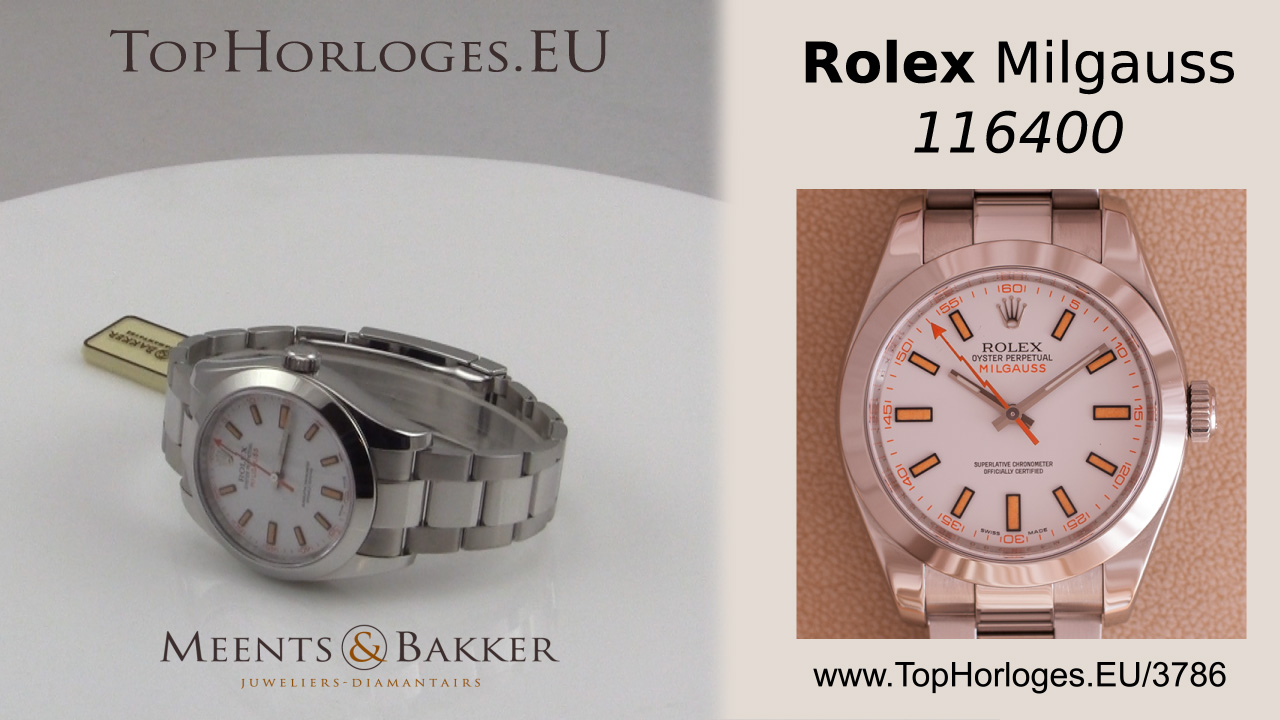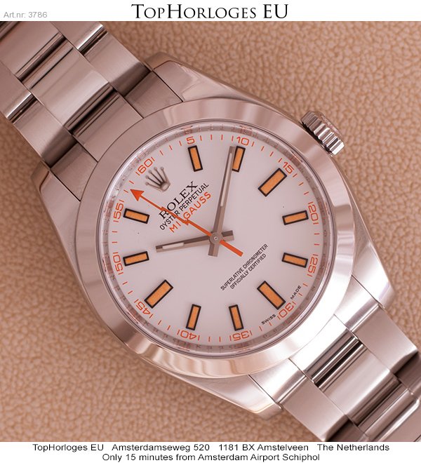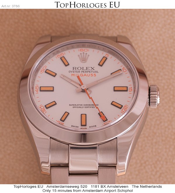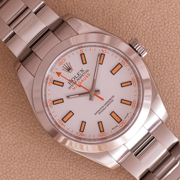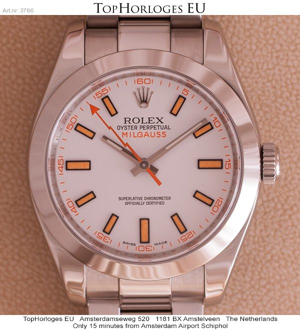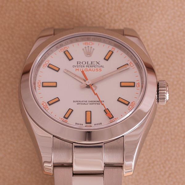 Een weinig gedragen stalen Rolex Milgauss met stalen Oyster band. Witte wijzerplaat met oranje index.