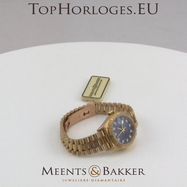 Een 18krt geelgouden dames Rolex Datejust. Deze " boomschors "uitvoering is in een pracht staat, voorzien van een originele diamanten wijzerplaat. Geheel compleet met doos en papieren.