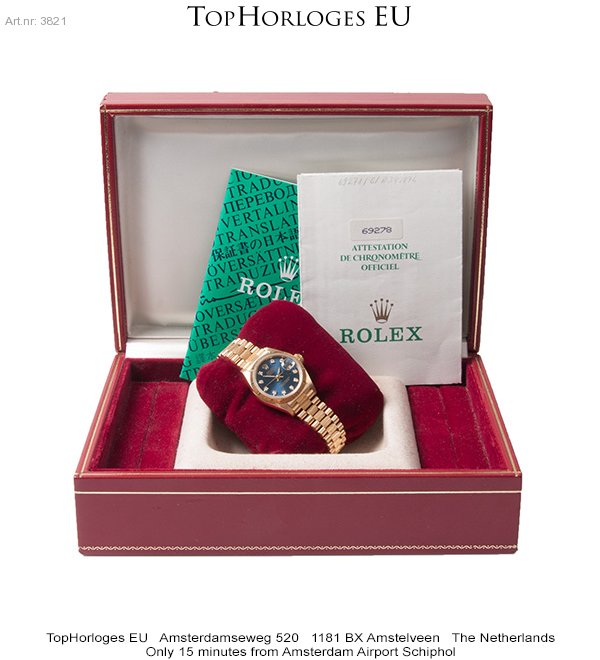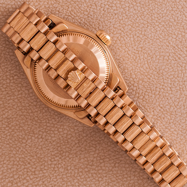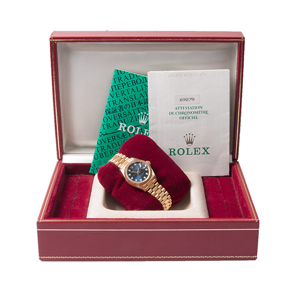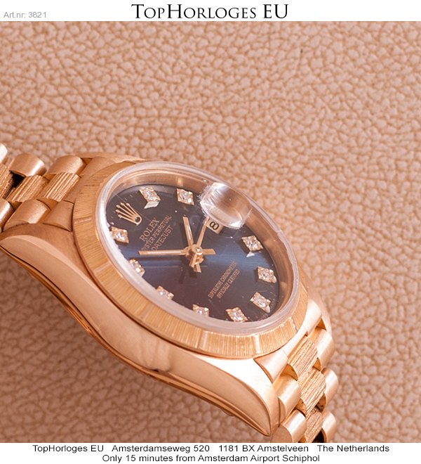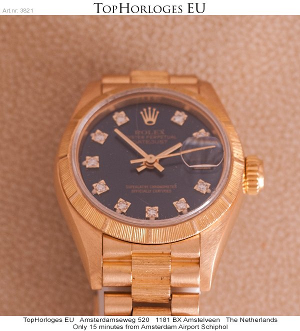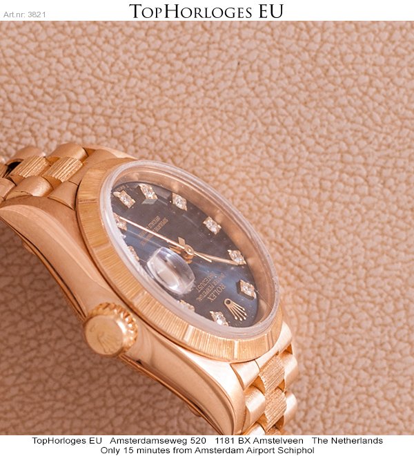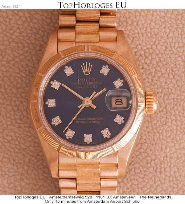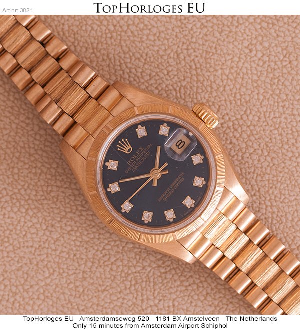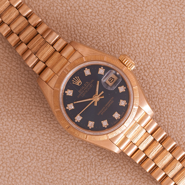 An very nice 18krt gold ladies datejust " bark ". Comes with a stunning factory original diamond dial. Complete with box and papers.