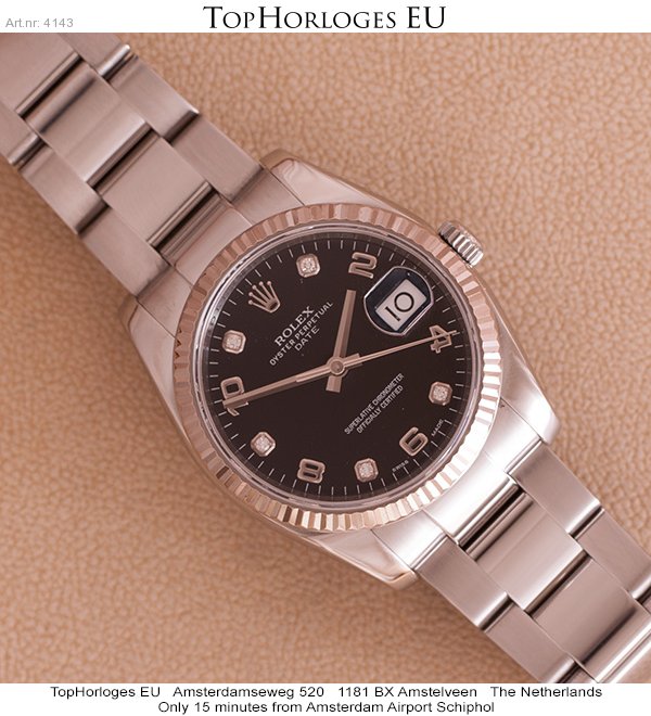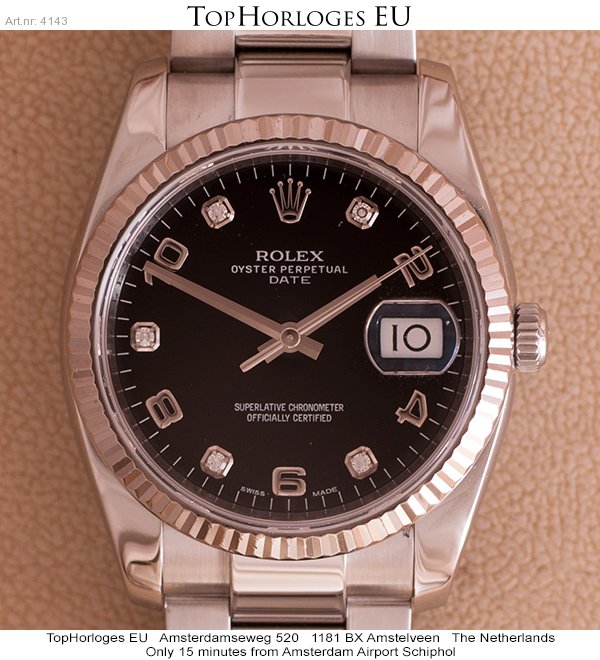 Zwarte wijzerplaat met arabische/diamanten index.