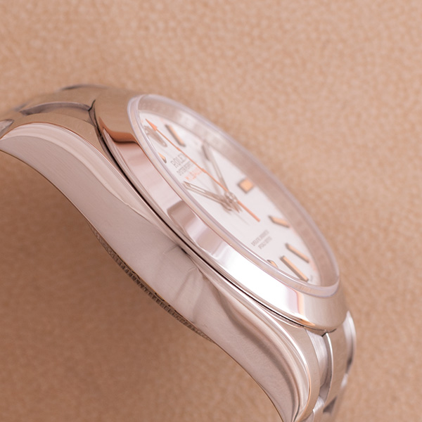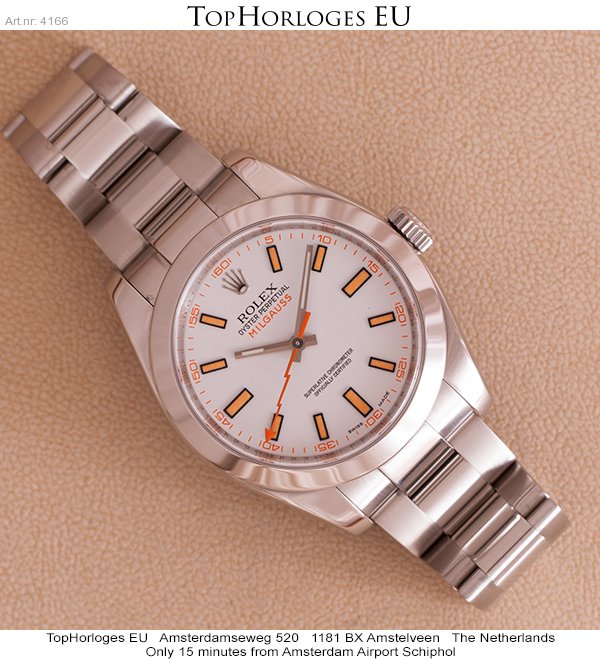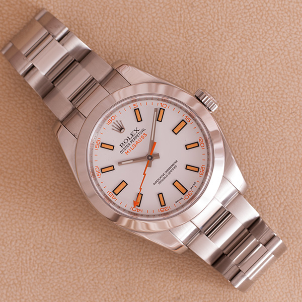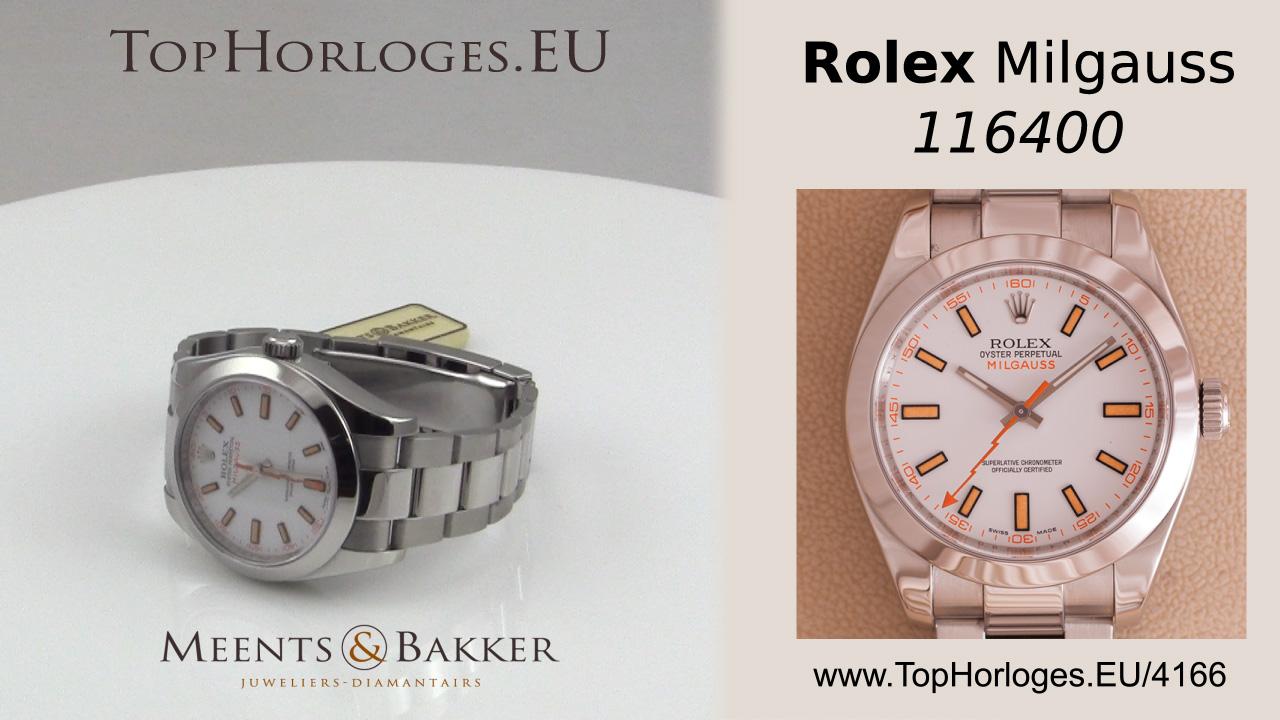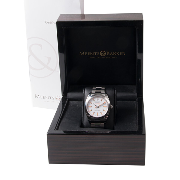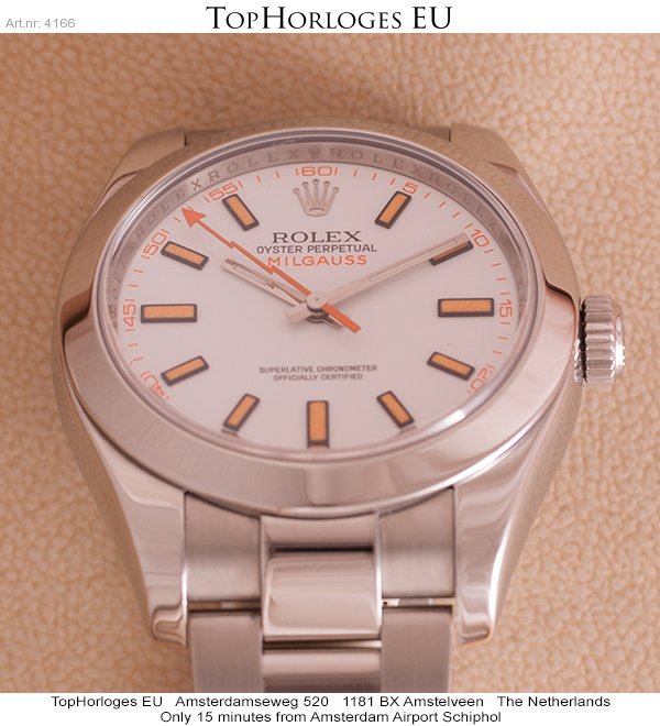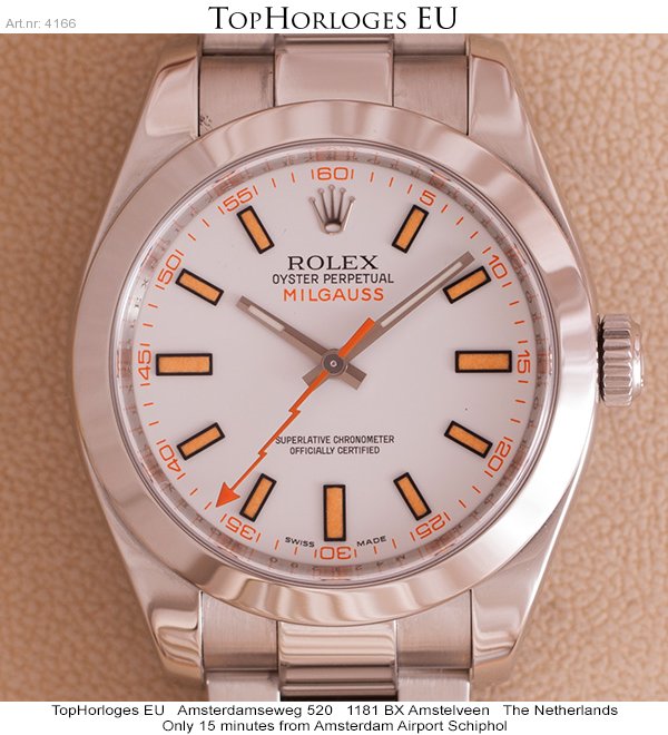 Een weinig gedragen stalen Rolex Milgauss met stalen Oyster band. Witte wijzerplaat met oranje index.
