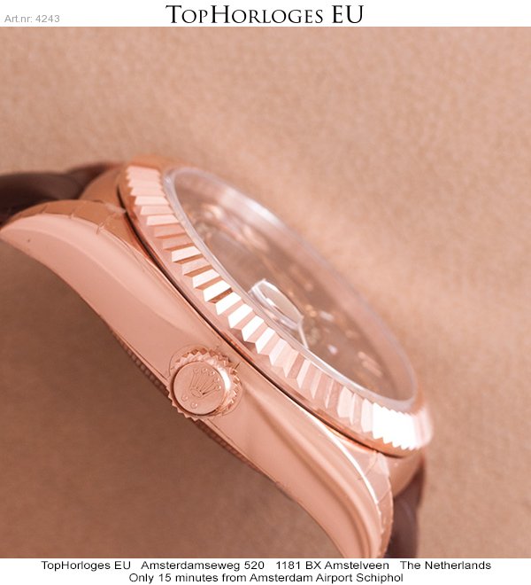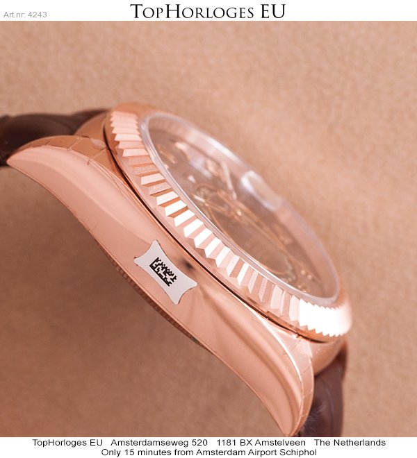 Een nieuwe Rolex Skydweller in het rozegoud met bruine lederen band en vouwsluiting.