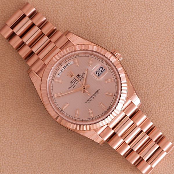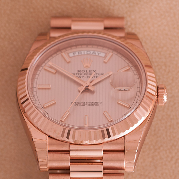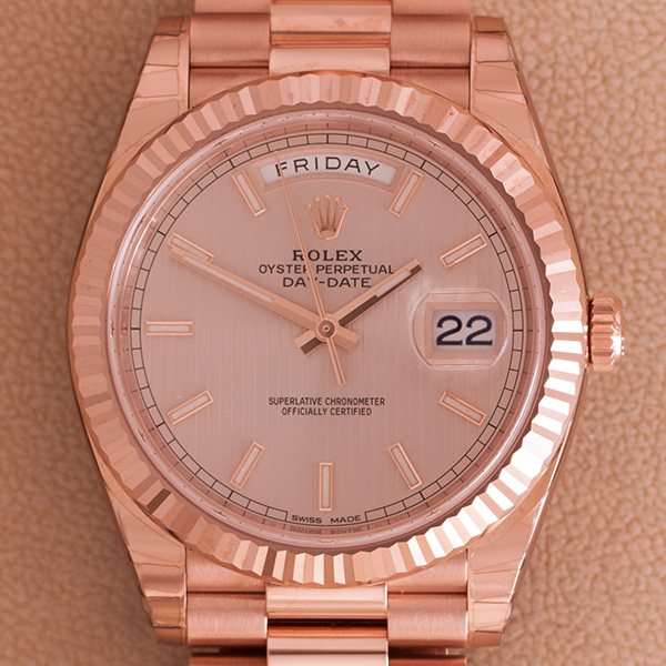 Slechts een enkele keer om een pols geweest, deze schitterende rozegouden Rolex Day-Date 40mm.