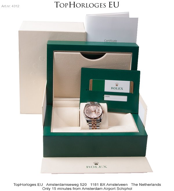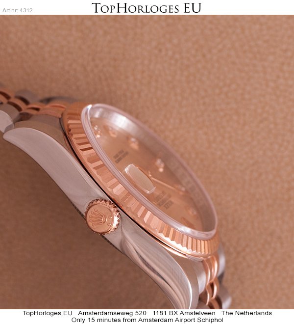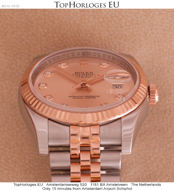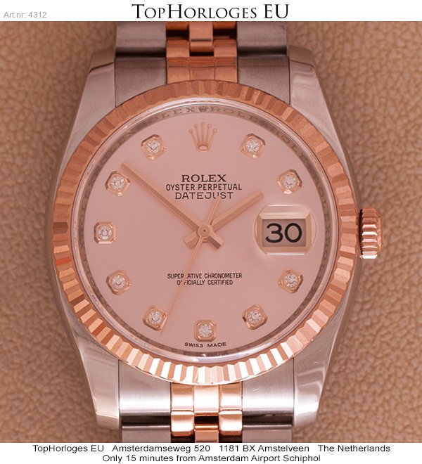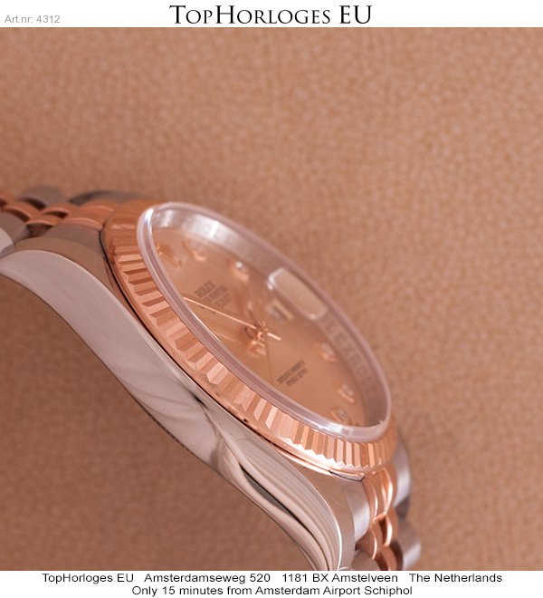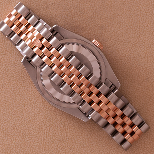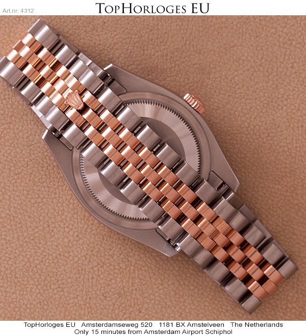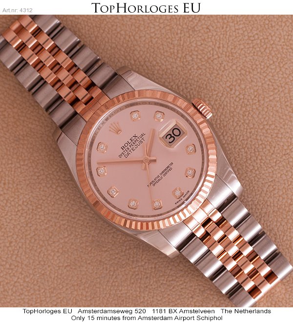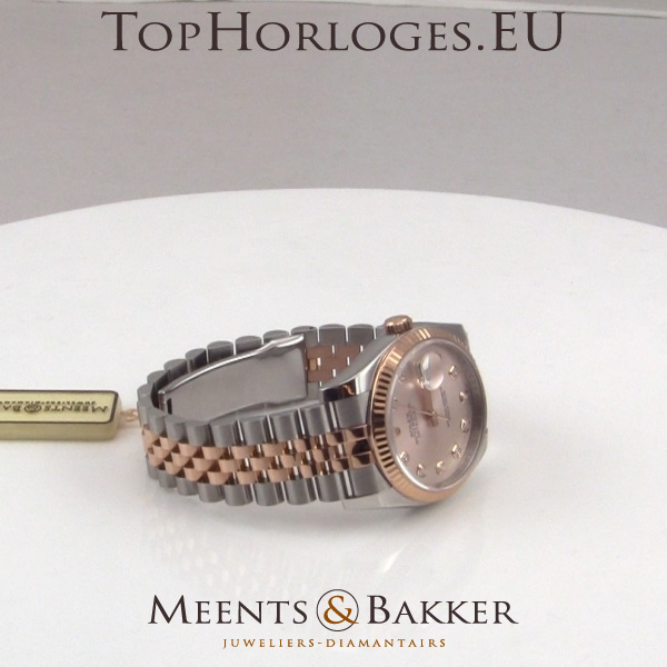 Een prachtige rozegoud met stalen Rolex dateJust met lichtroze wijzerplaat en briljanten index. Deze full size, 36mm uitvoering is in een schitterende staat.