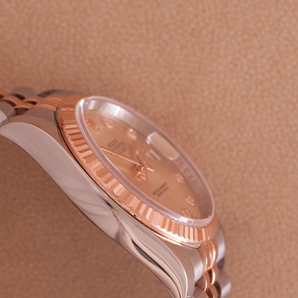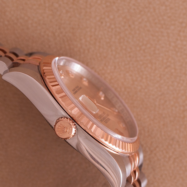 An almost unworn Rolex datejust. This very desirable, 36mm model is gorgeous. Stunning light-pink dial with diamond hourmarkers.