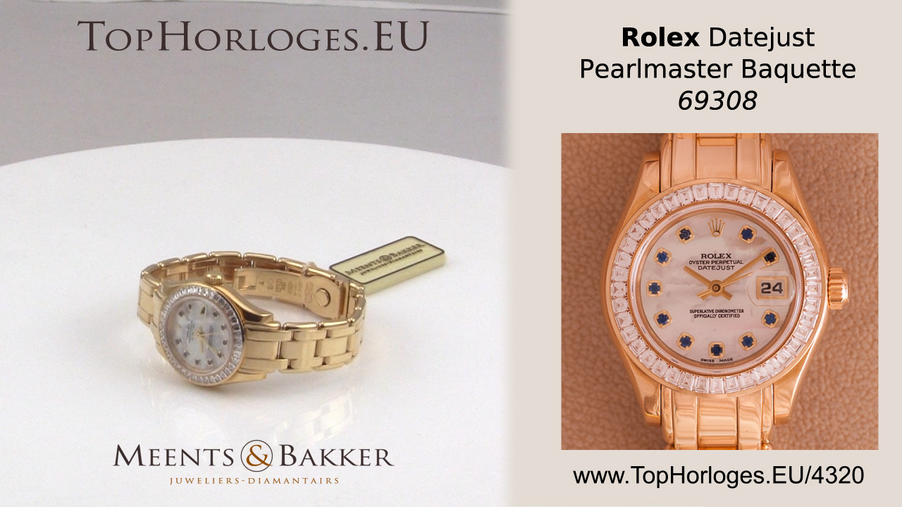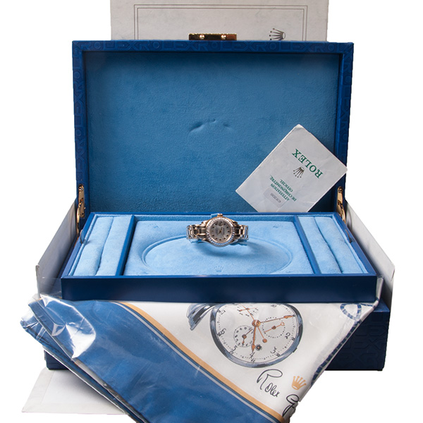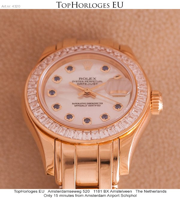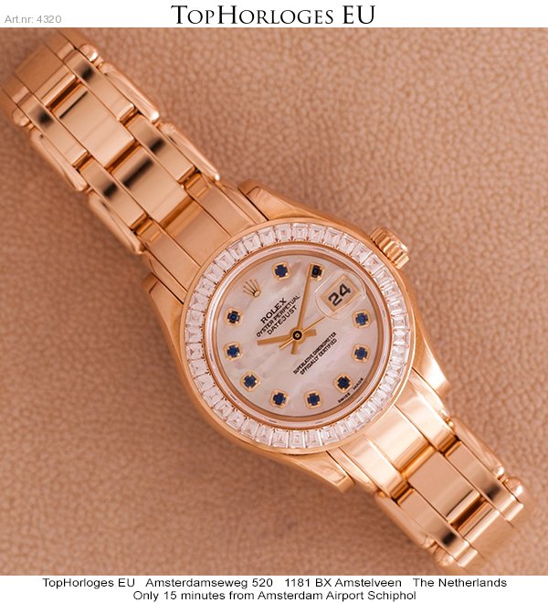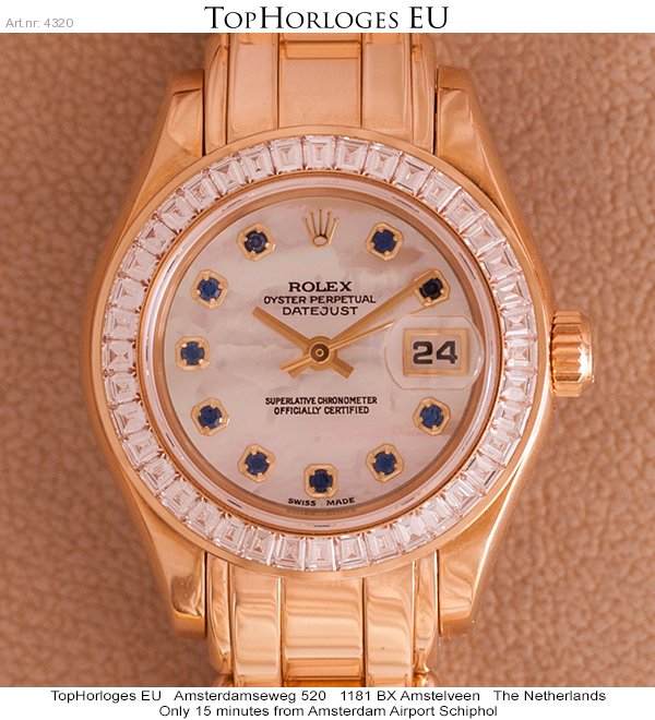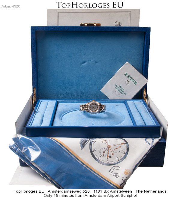 Een prachtige dames Rolex Datejust. Deze geheel originele uitvoering is in een prachtige staat, voorzien van een schitterende parelmoeren wijzerplaat met saffieren index. Deze haast ongedragen Pearlmaster komt kompleet met de doos, Rolex sjaal en de papieren.(LC100)