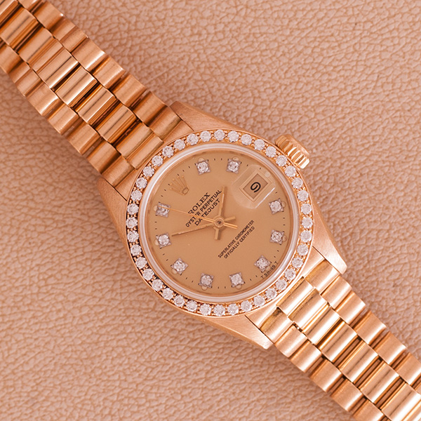 Beautiful Ladies Rolex watch in 18k yellow gold with original factory mounted diamond bezel and diamond index.