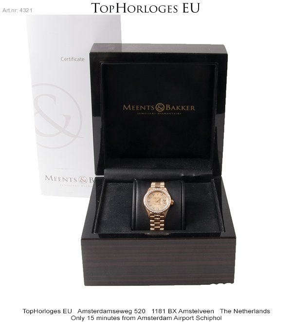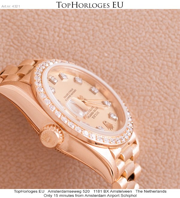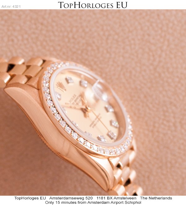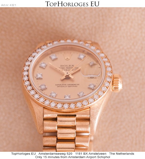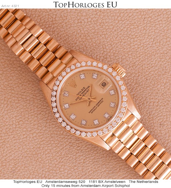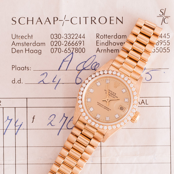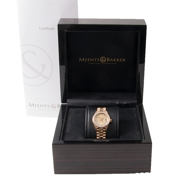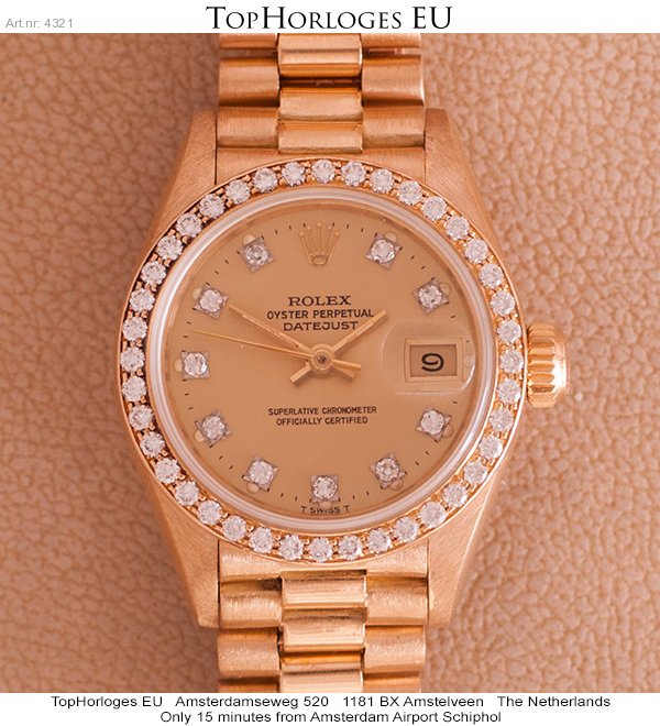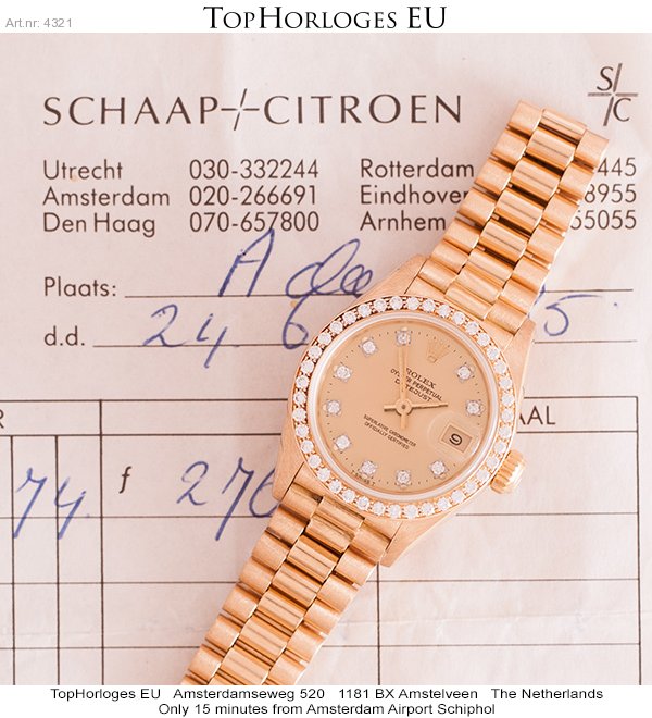 Een 18krt geelgouden dames Rolex. Deze schitterende Datejust uitvoering is door de Rolex fabriek voorzien van een origineel met briljanten bezette lunettte en een wijzerplaat met diamanten index.