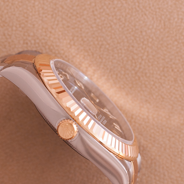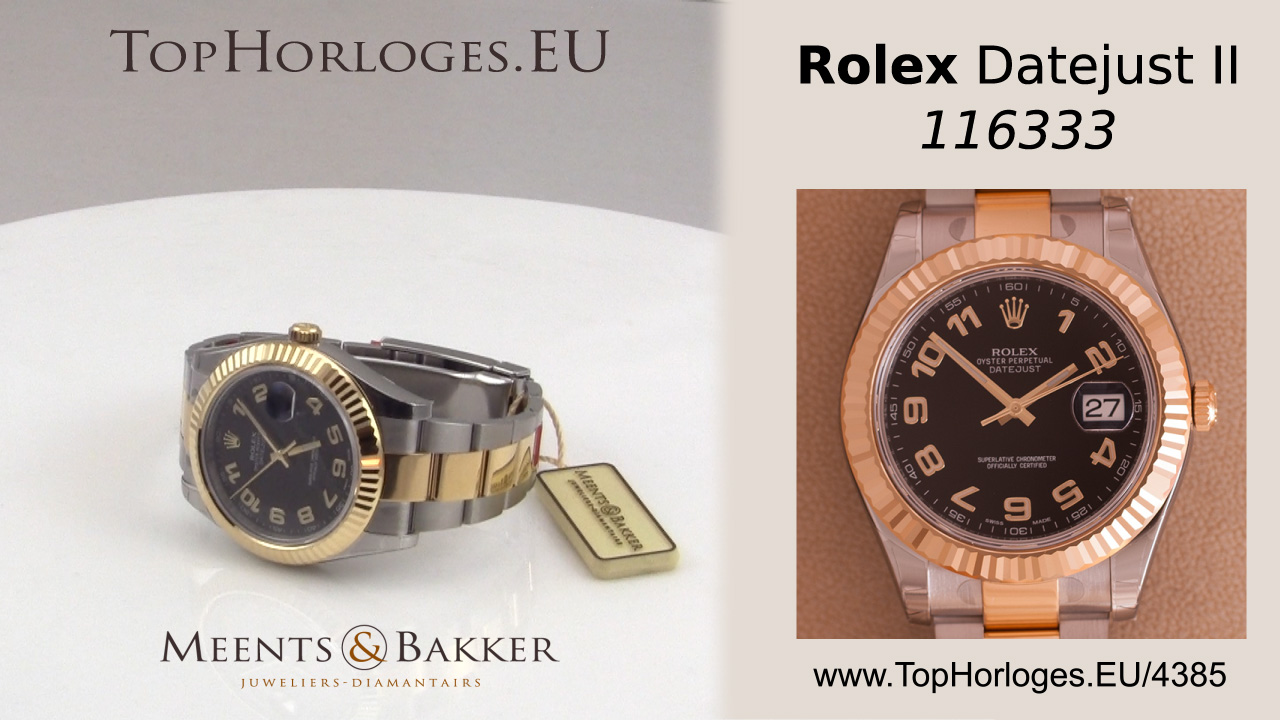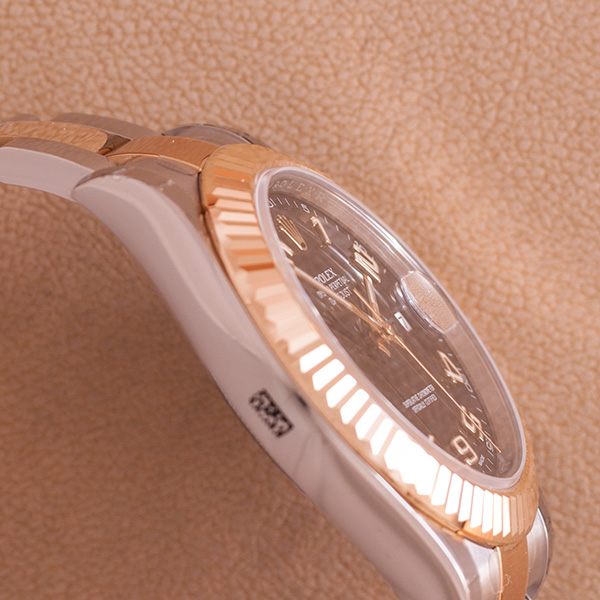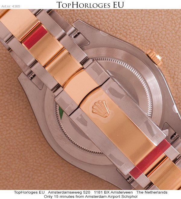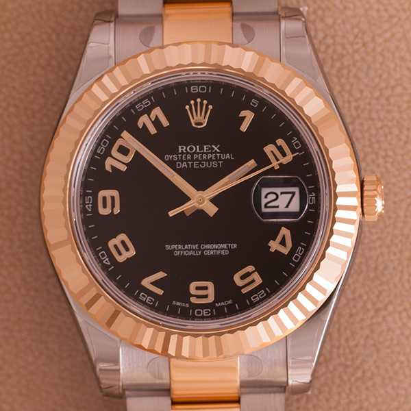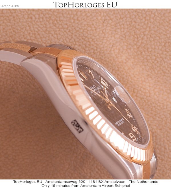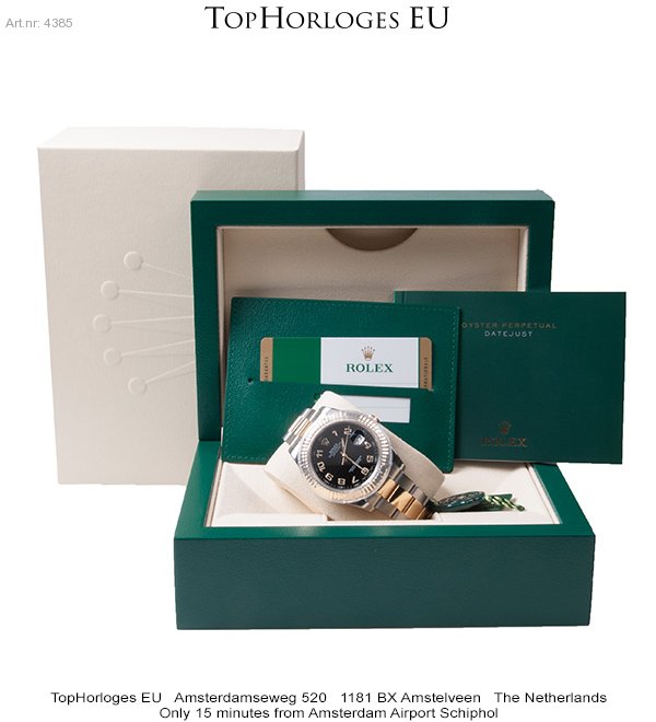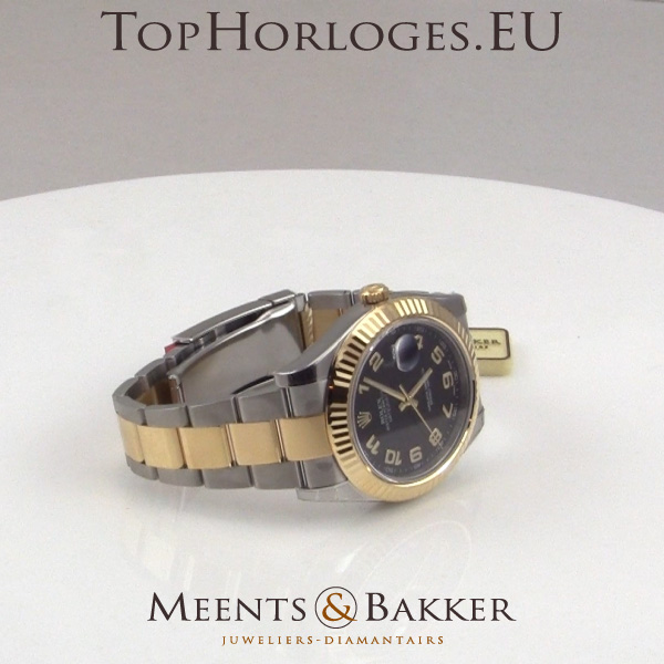 Een nieuwe, goud-stalen Rolex dateJust 2. Deze full size uitvoering heeft een zwarte wijzerplaat met gouden arabische index.