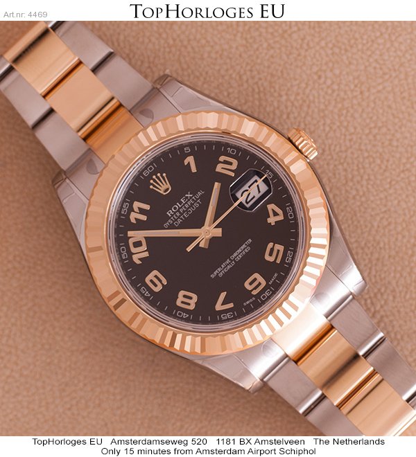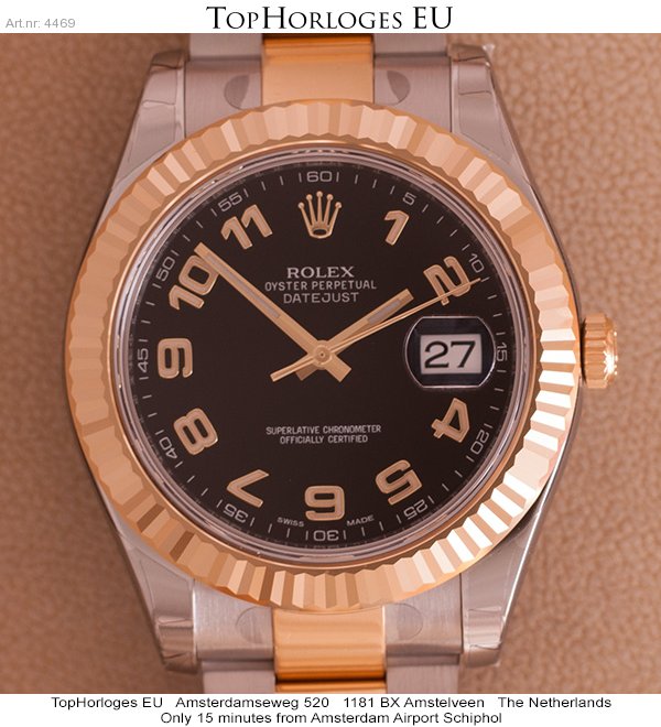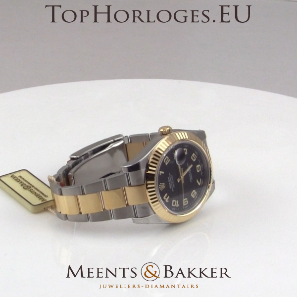 Een nieuwe, goud-stalen Rolex dateJust 2. Deze full size uitvoering heeft een zwarte wijzerplaat met gouden arabische index.