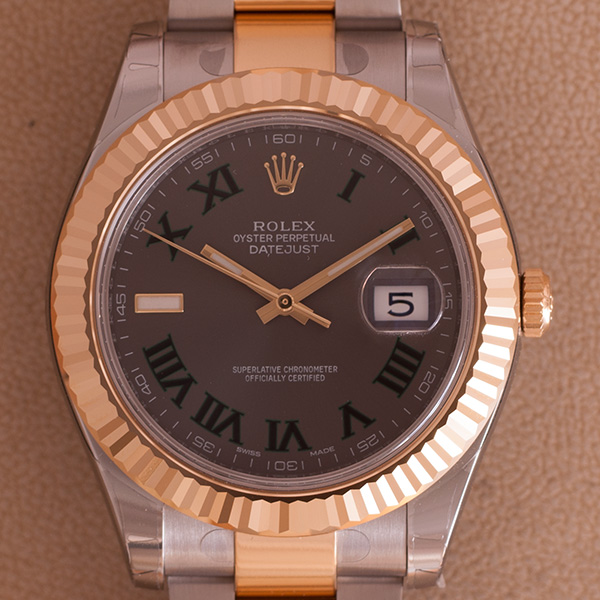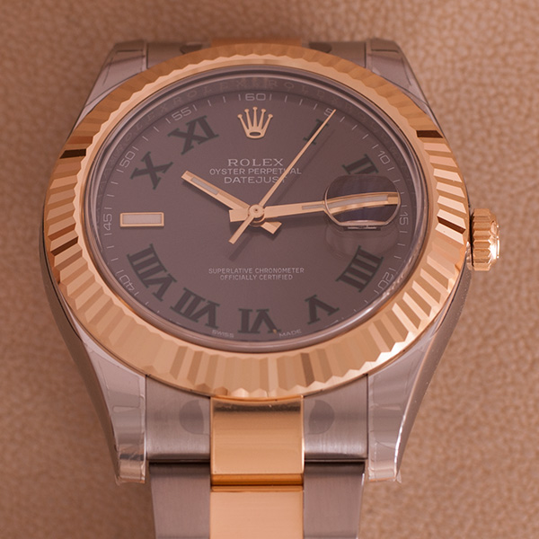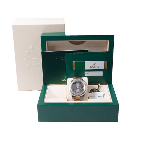 Een nieuwe, goud-stalen Rolex dateJust 2. Deze full size uitvoering heeft een Slate Grey wijzerplaat.