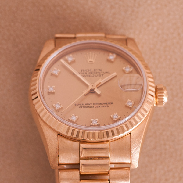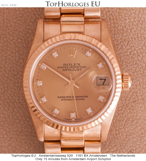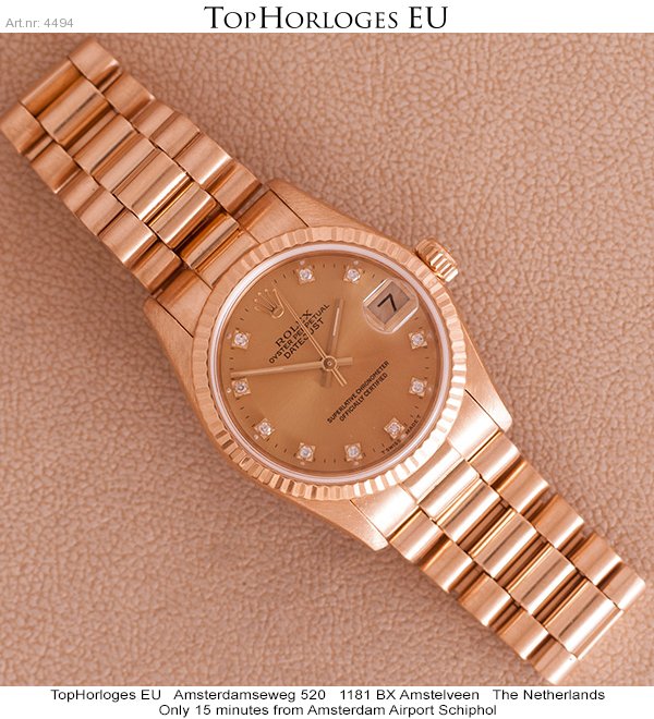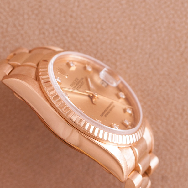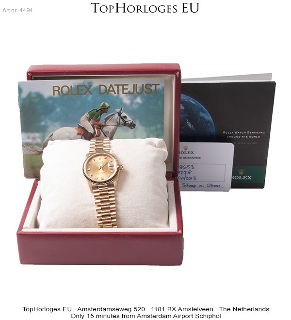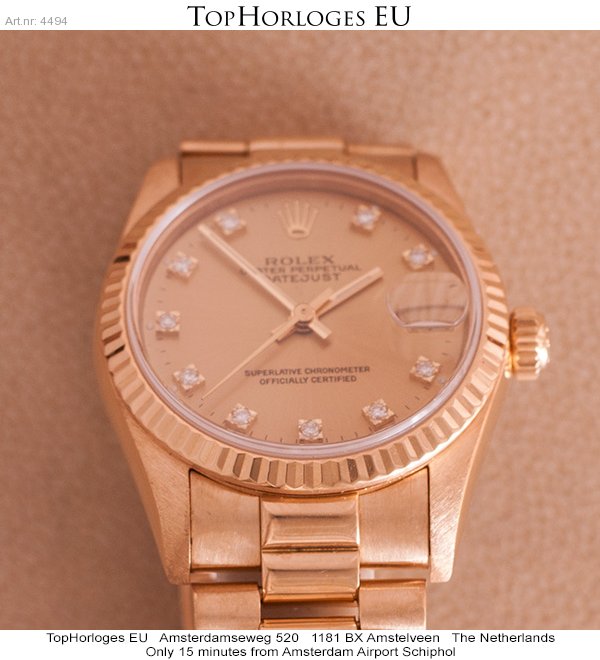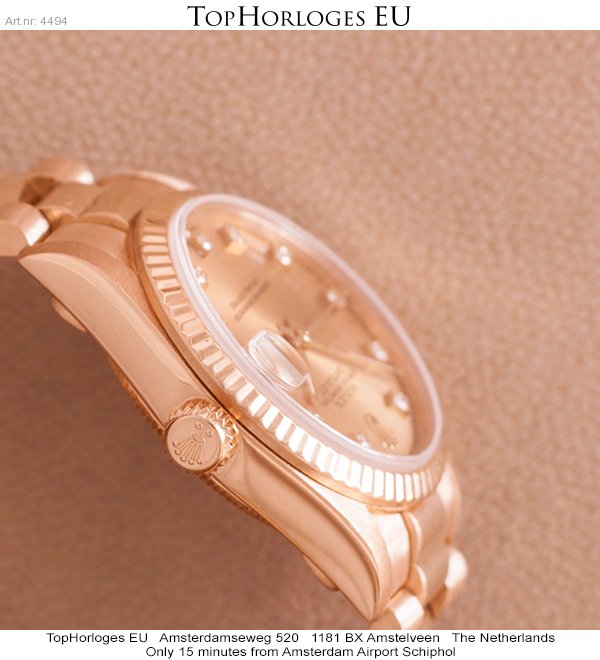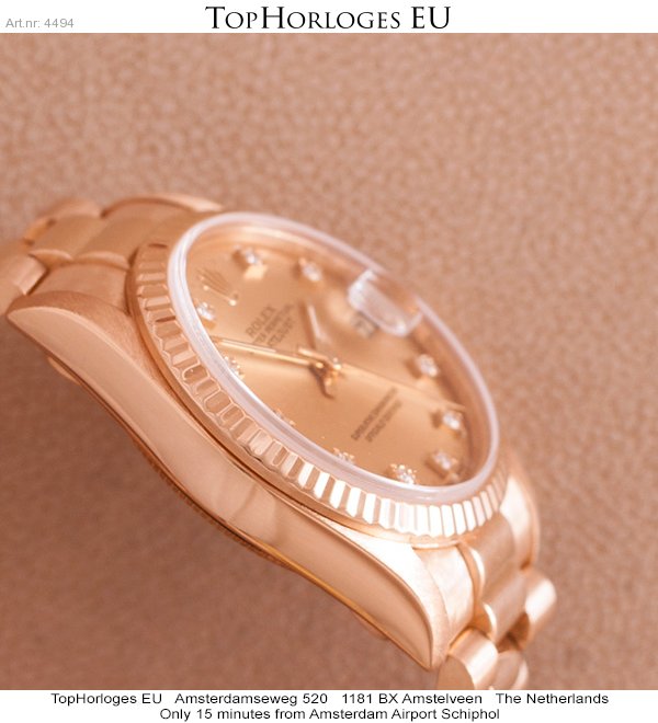 Een weinig gedragen gouden Rolex, deze Mid-Size uitvoering heeft een prachtige President band en is in een zeer mooie staat. Schitterende wijzerplaat met diamanten uur indexen. ( Rolex Ful Service 10-2013 )