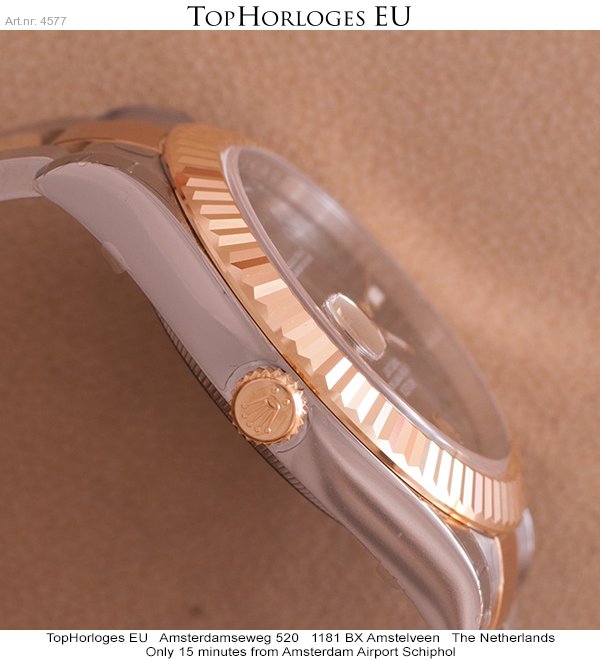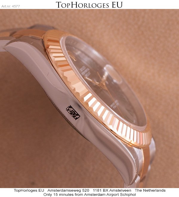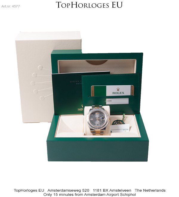 Een nieuwe, goud-stalen Rolex dateJust 2. Deze full size uitvoering heeft een Slate Grey wijzerplaat.