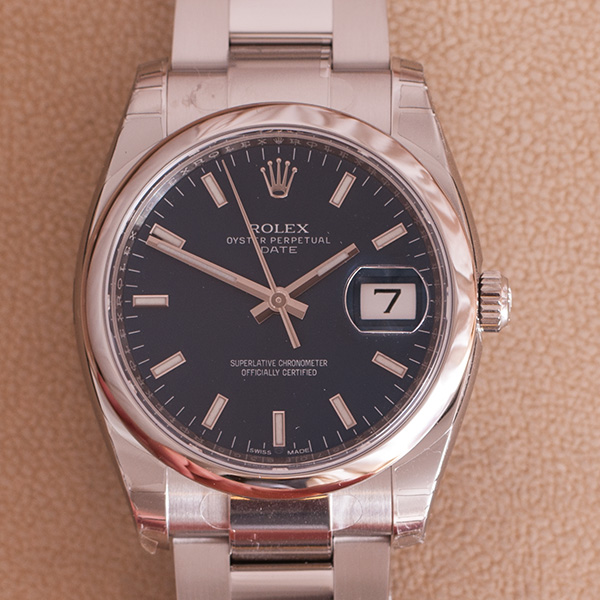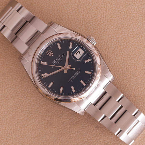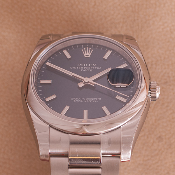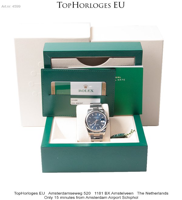 Een nieuwe stalen Rolex date 34mm met blauwe wijzerplaat.
