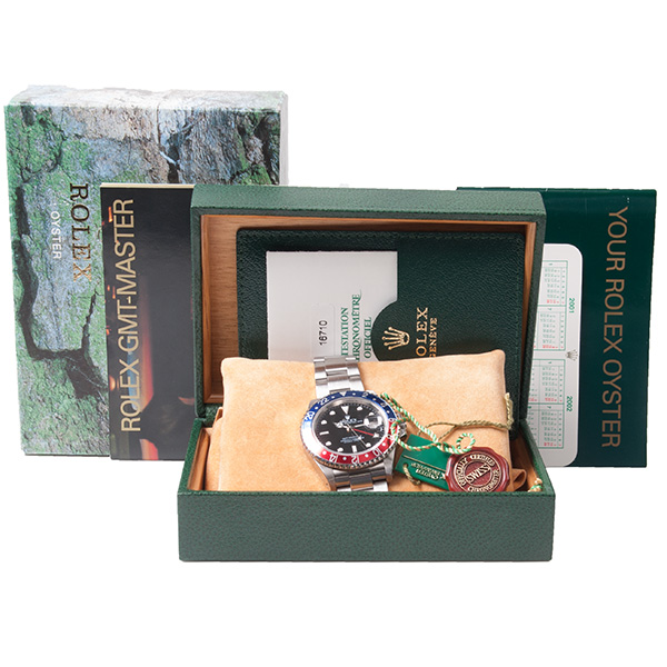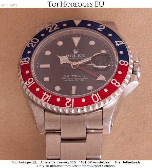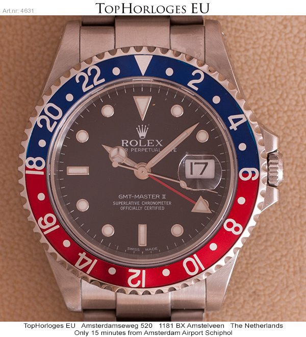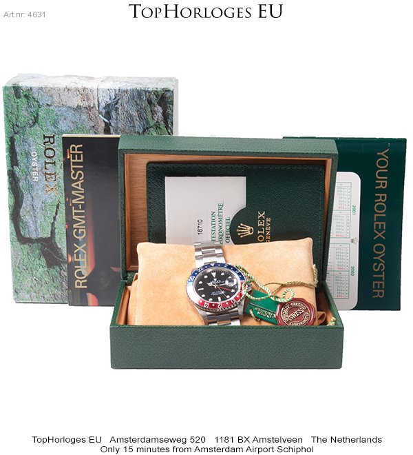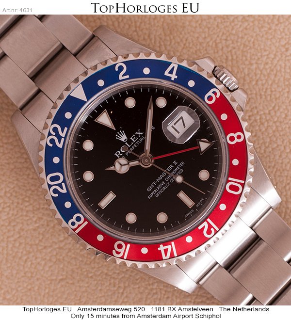 Here is a very desirable Rolex GMT Master II. This "Pepsi" version is complete with the box, booklet, tag's and the original papers.(09-2001NL)