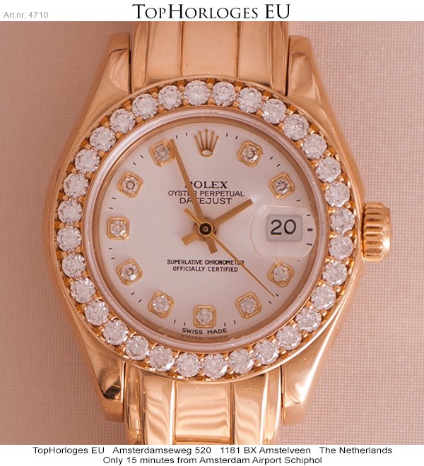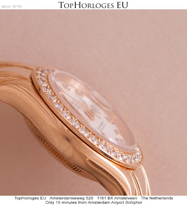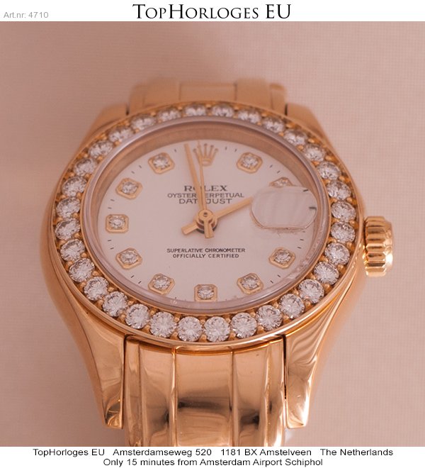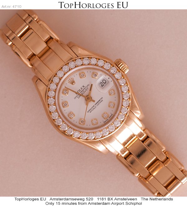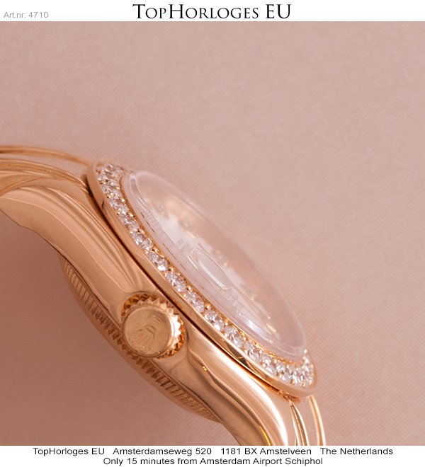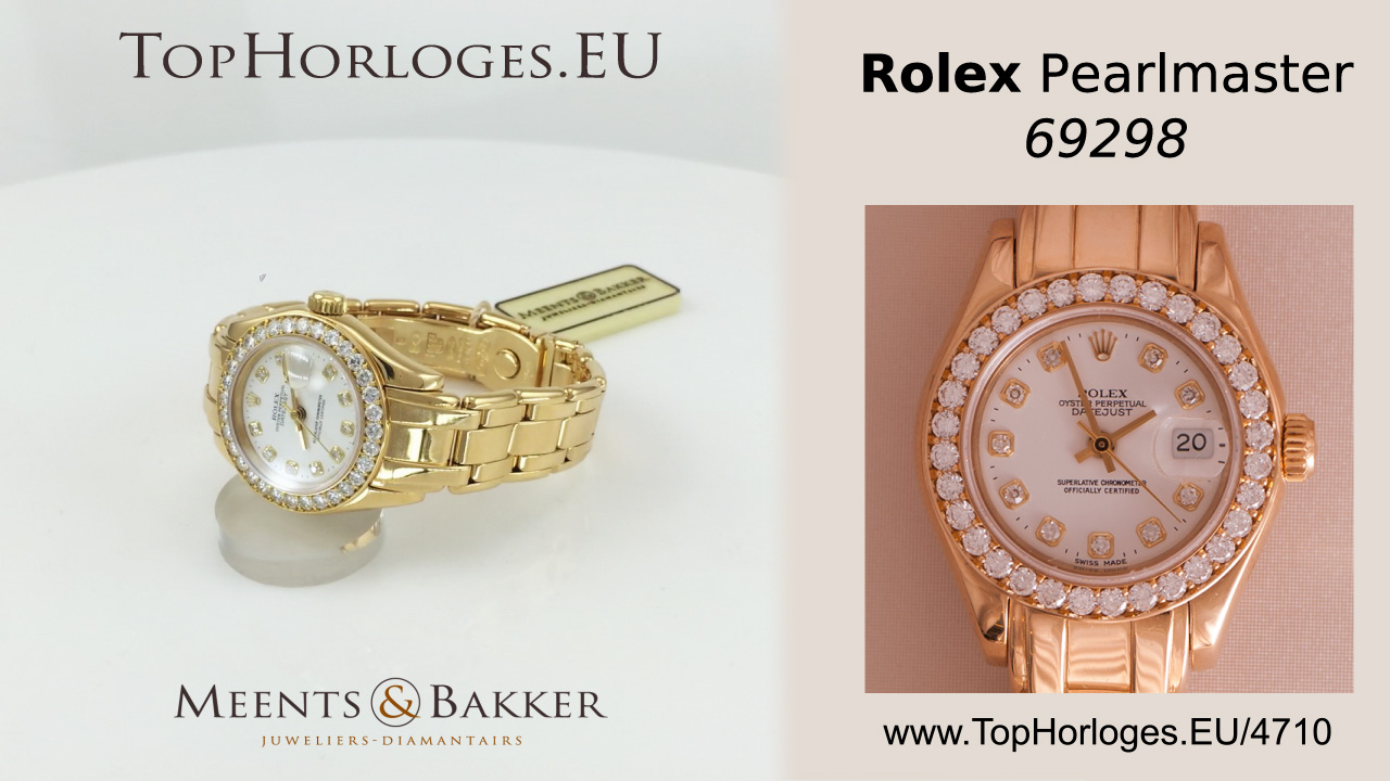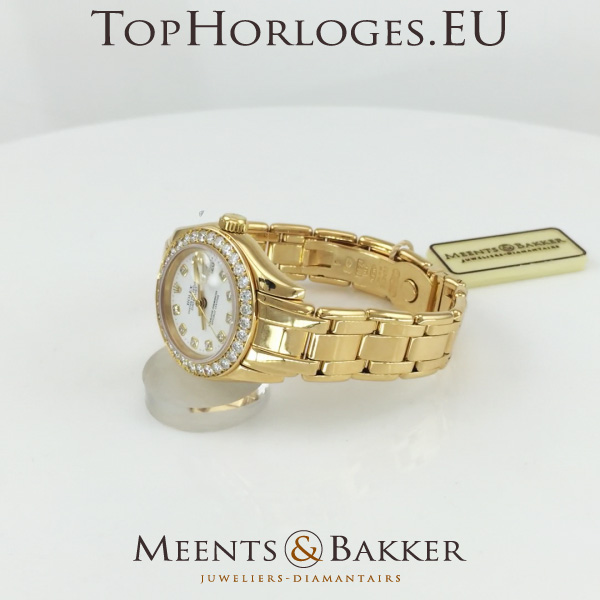 Een zeer mooie Rolex Pearlmaster met gouden band. Deze prachtige Datejust is voorzien van een originele briljanten lunette en witte wijzerplaat met diamant op de uren.