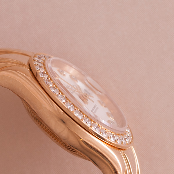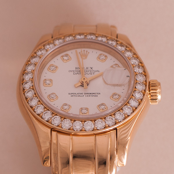 Gorgeous Rolex Pearlmaster Lady in yellow gold with factory original diamond bezel and a white-dial with diamond index.