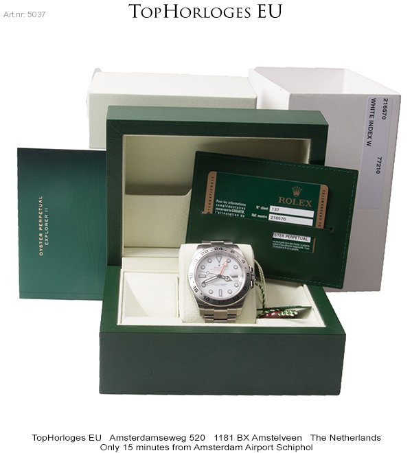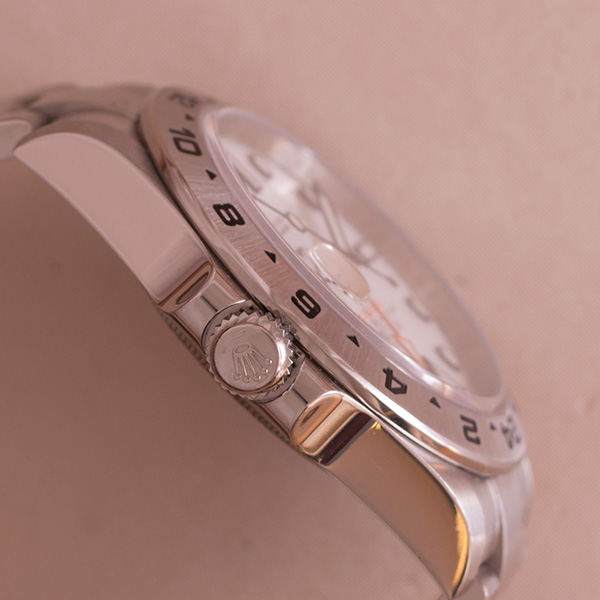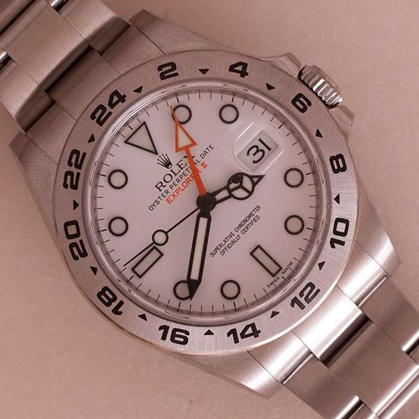 Een haast ongedragen Rolex Explorer II, met witte wijzerplaat.