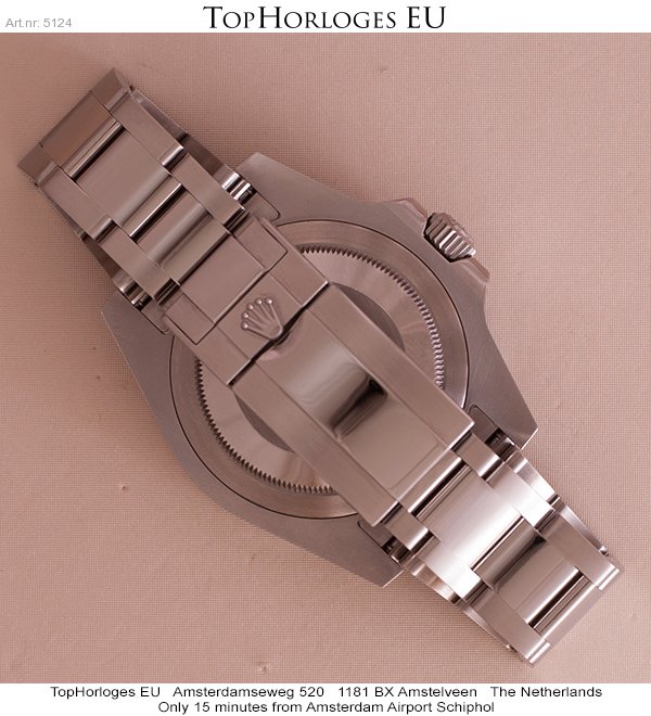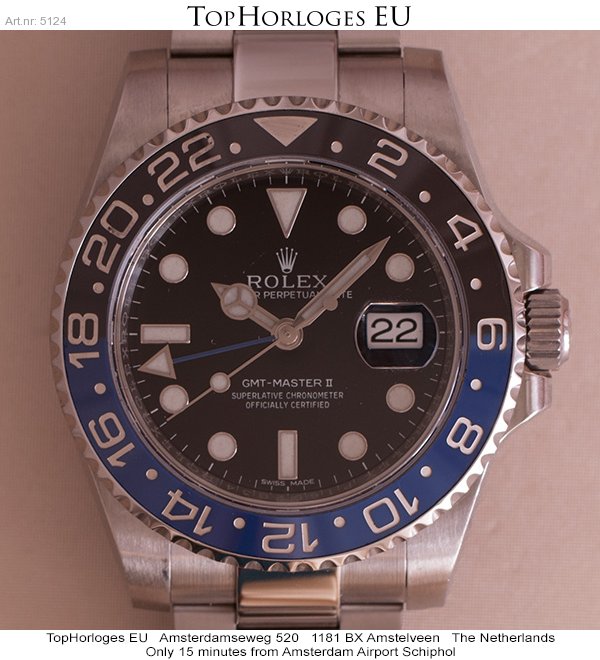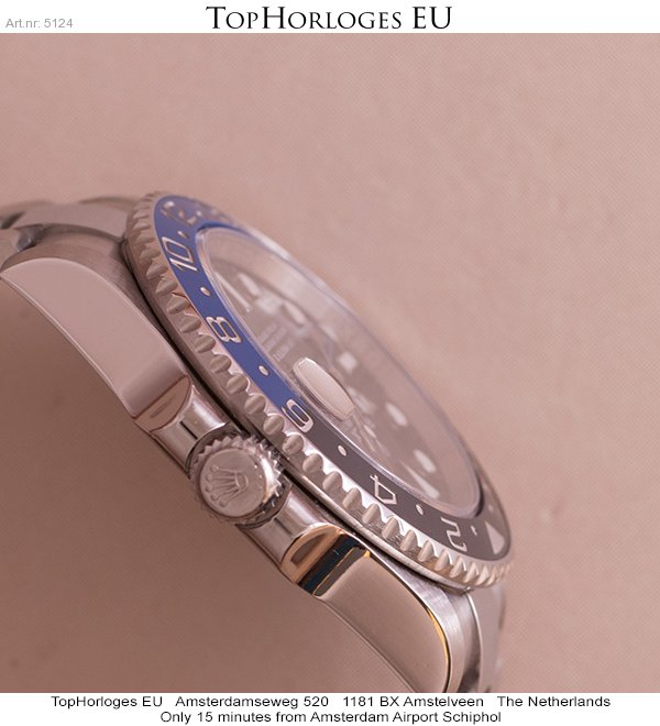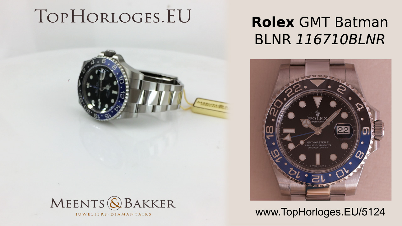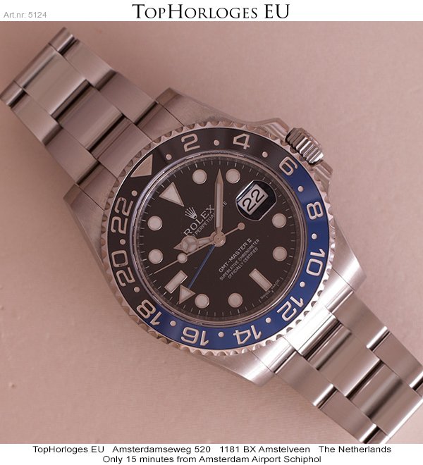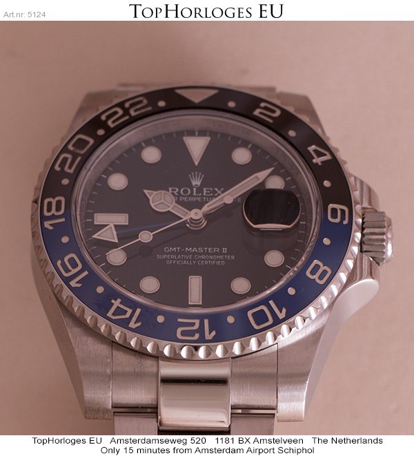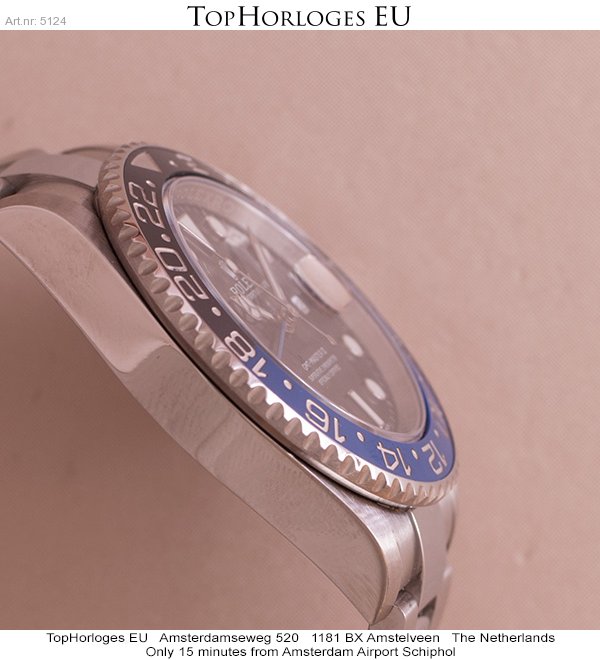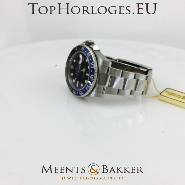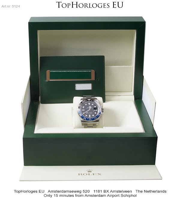 Een zogoed als ongedragen Rolex GMT met zwart/blauwe lunette. Deze Batman is compleet met de doos en de papieren.(12-2014NL)