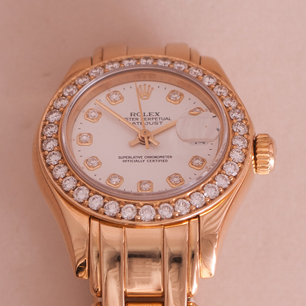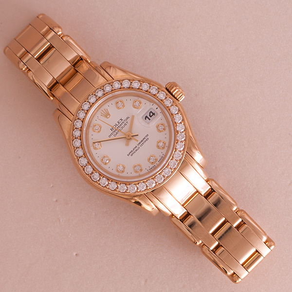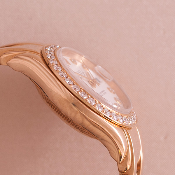 Beautiful Rolex Lady Datejust Pearlmaster in yellow gold a white dial with diamond index.