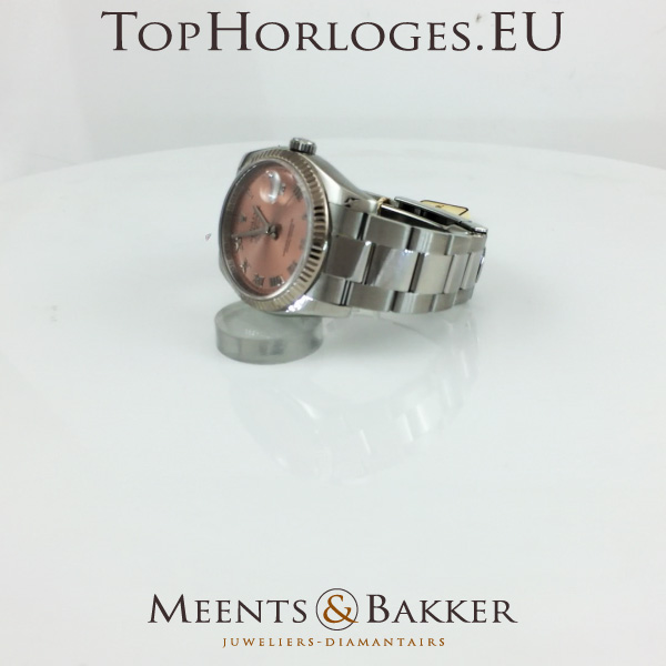Rozekleurige wijzerplaat met zilveren Romeinse index.