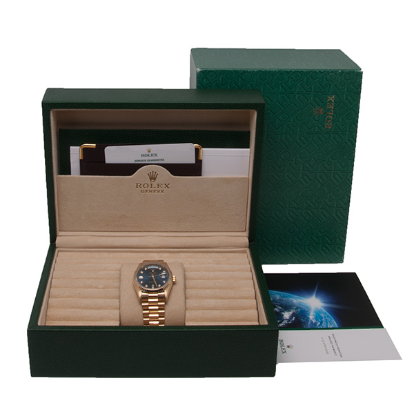 Een schitterende Rolex Day-Date. Deze gouden 36mm uitvoering is in een prachtige staat en voorzien van een diep blauwe wijzerplaat met diamanten index.