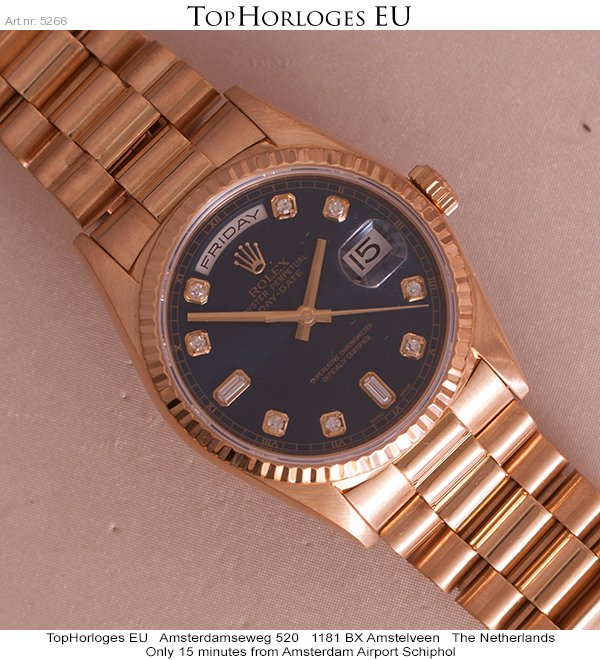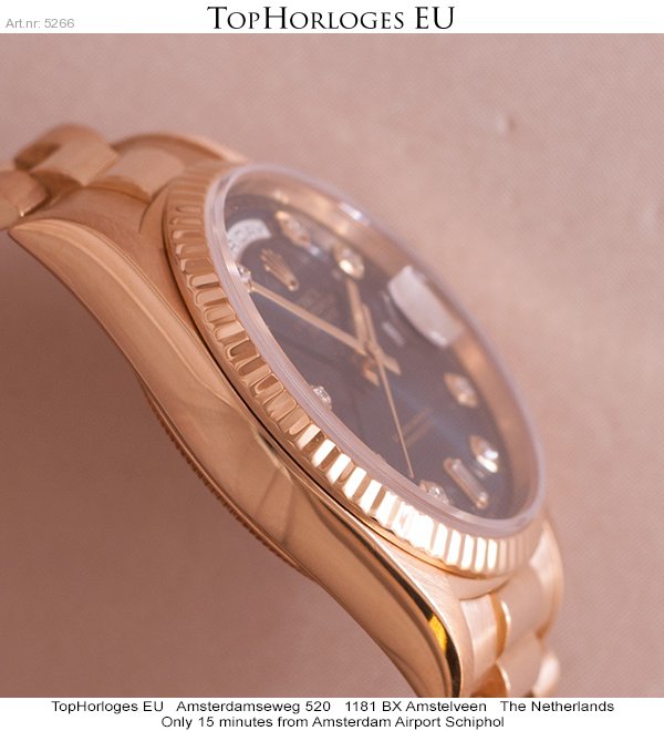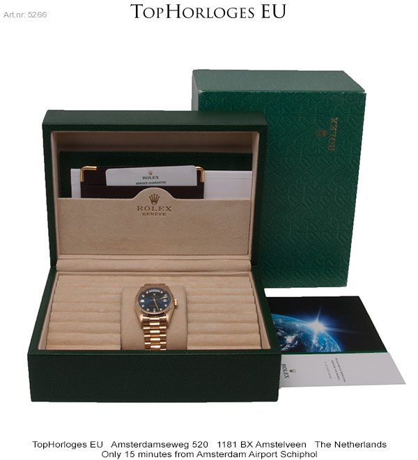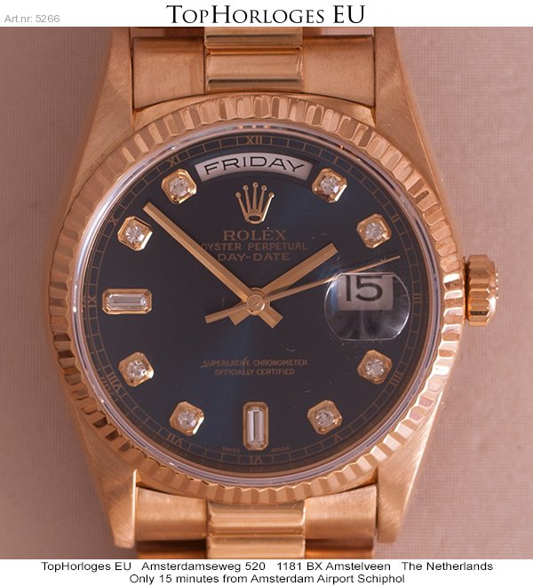 Very nice and desirable Rolex Day-Date. This stunning 36mm golden version is in a gorgeous condition an has a beautiful dark blue dial with diamond hourmarkers.