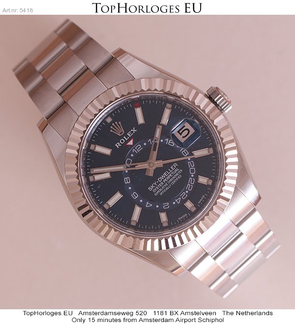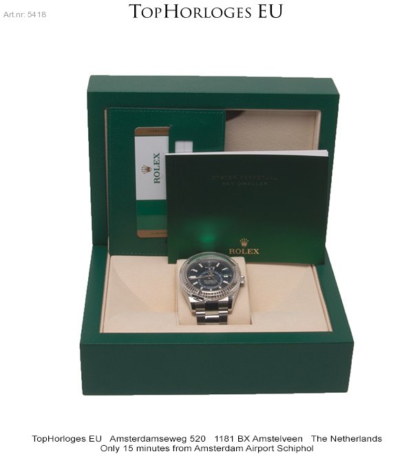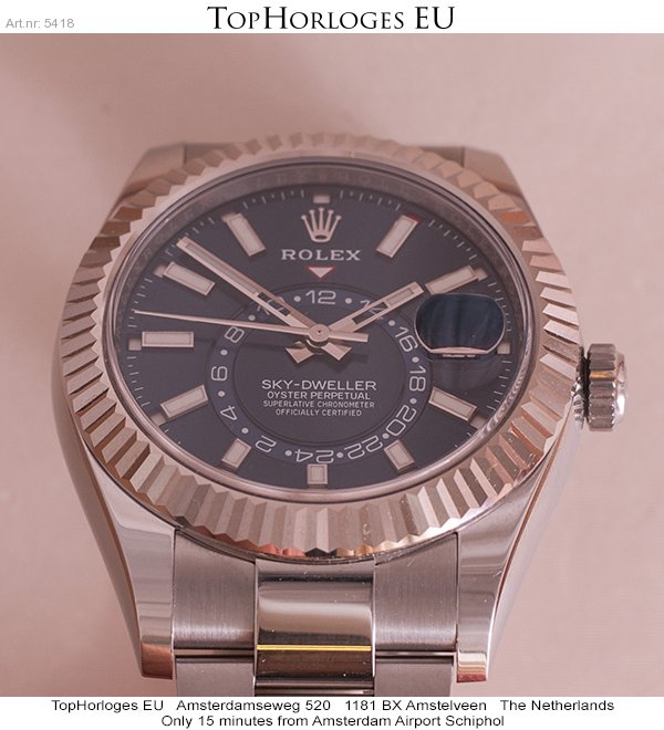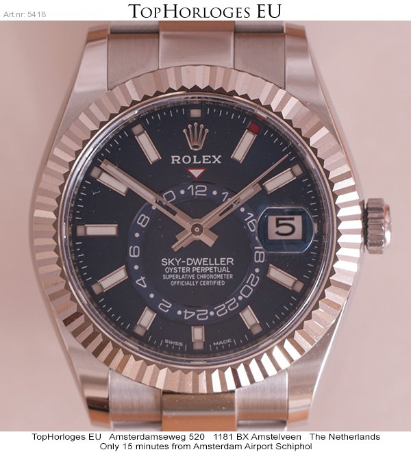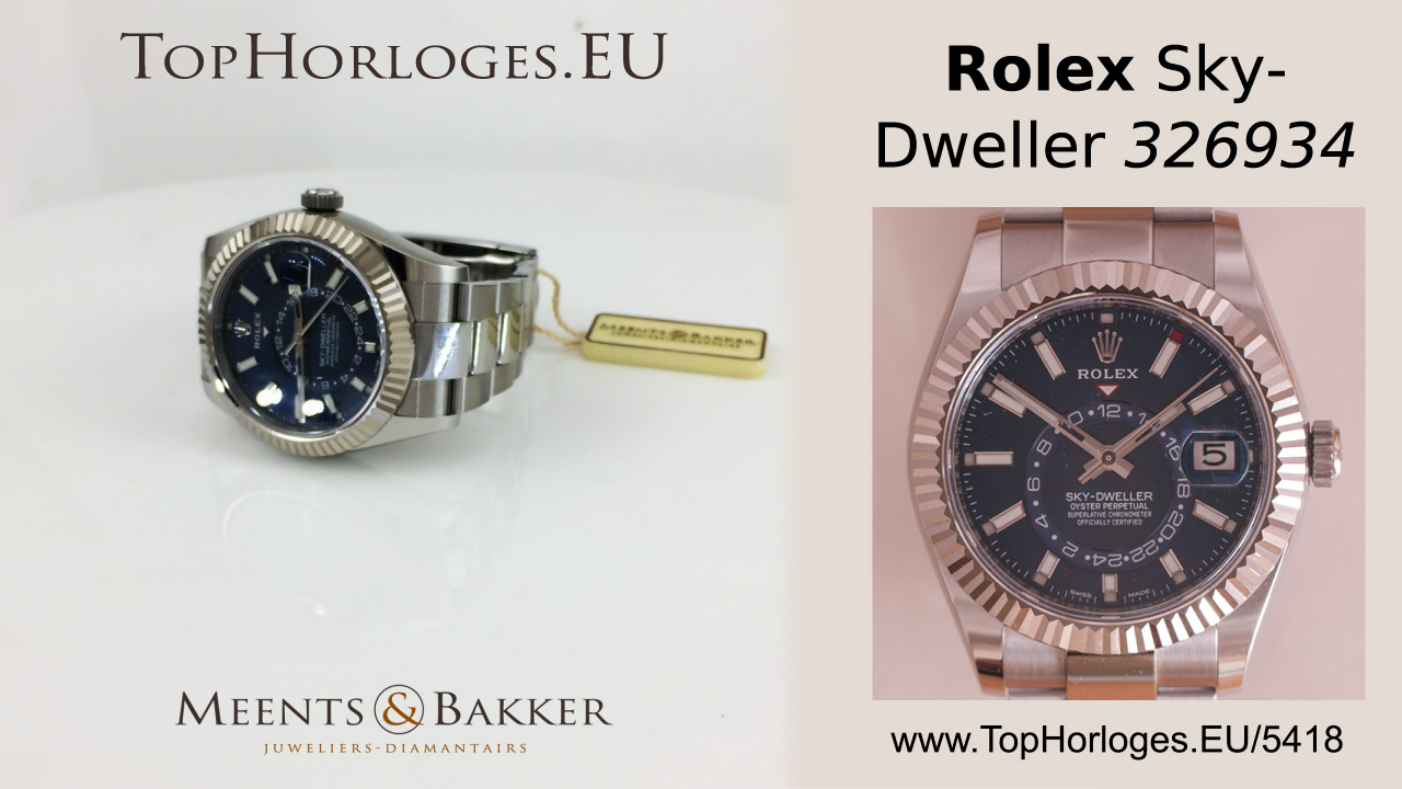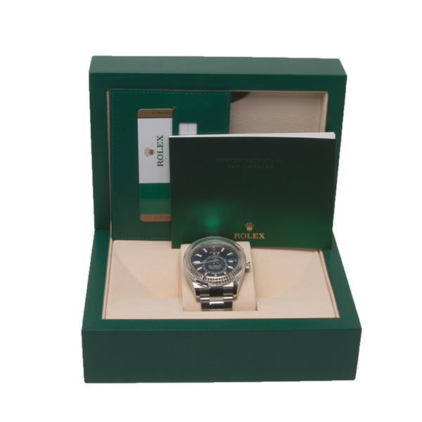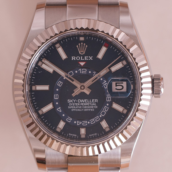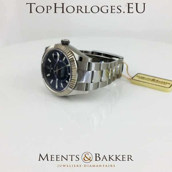 Een ongedragen Rolex Sky-Dweller in het staal met blauwe wijzerplaat.