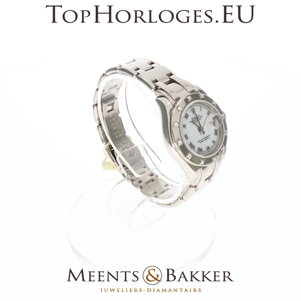 Een werkelijk zeer weinig gedragen dames Rolex Pearlmaster. Deze volledig witgouden uitvoering heeft een witte wijzerplaat met romeinse index en originele lunette bezet met 12 briljnaten.